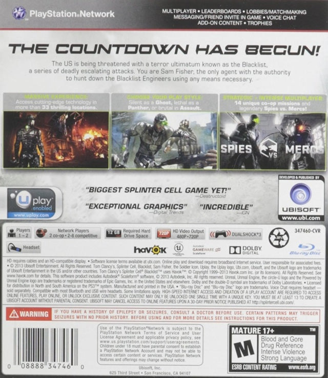 Sam Fisher returns, deadlier than ever, in Tom Clancy's Splinter Cell: Blacklist for the Playstation 3. As the commander of the newly formed Fourth Echelon, a covert unit answering directly to the President, you must hunt down the terrorists behind "The Blacklist," a series of escalating attacks on U.S. interests. Utilize the refined "Killing in Motion" system, advanced gadgets, and strategic squad commands. Experience a gripping single-player campaign, cooperative missions, and the return of the popular Spies vs. Mercs multiplayer mode, offering a comprehensive and action-packed stealth experience.