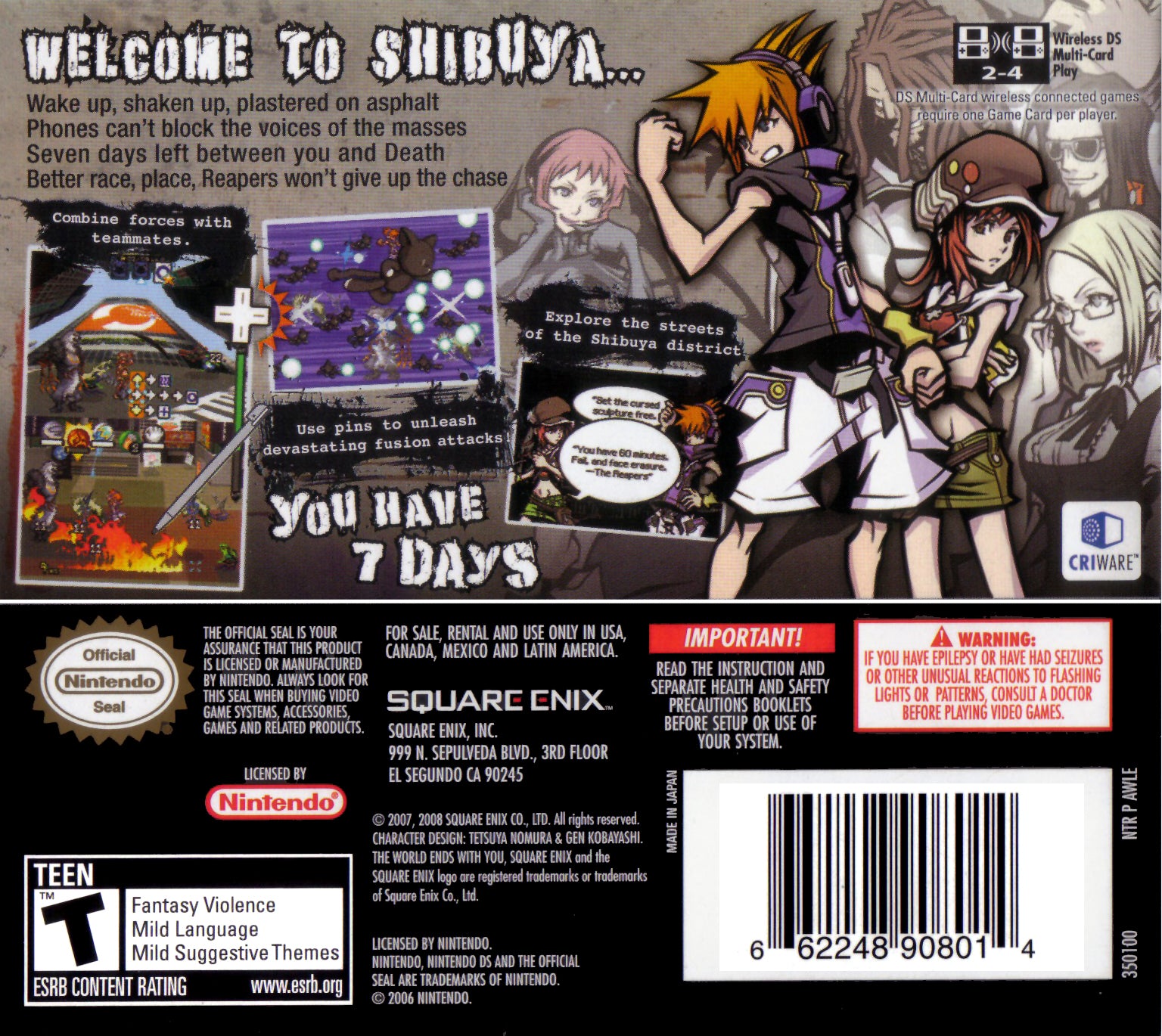 Immerse yourself in the vibrant and perilous urban landscape of Shibuya in The World Ends with You for the Nintendo DS. As the antisocial Neku Sakuraba, you awaken to find yourself a reluctant participant in the deadly "Reapers' Game," where failure means erasure. Utilize the innovative dual-screen combat system, controlling Neku on the touch screen and his partner on the top screen, to battle mysterious creatures called Noise. Collect stylish pins to unleash psychic abilities, uncover a compelling mystery, and fight for survival in this unique and critically acclaimed action RPG.