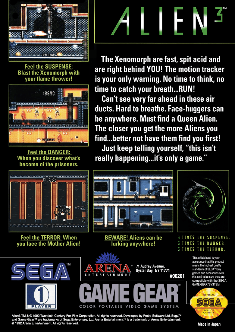 Nowhere is safe in Alien 3 for the Sega Game Gear. As Ellen Ripley, you are trapped on a desolate prison planet with a deadly Xenomorph on the loose. This intense action-platformer puts you in a desperate fight for survival as you navigate the complex maze of the Fury 161 facility. Rescue trapped prisoners and fend off alien attacks in a tense, claustrophobic atmosphere. Can you survive the perfect organism in this challenging handheld title?