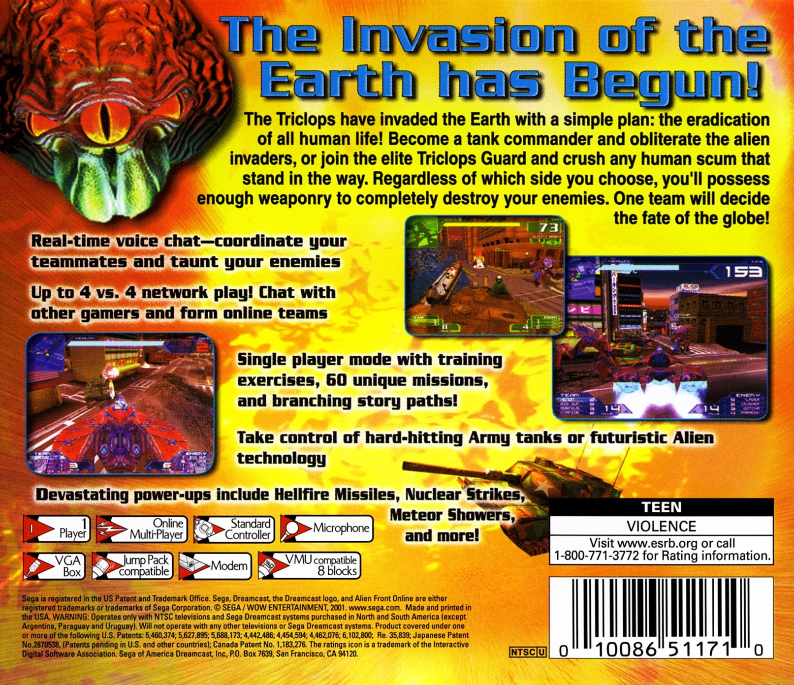 Team up and take on the alien horde in Alien Front Online for the Sega Dreamcast. This action-packed arcade shooter puts you in the driver's seat of a powerful armored vehicle, fighting for either the alien invaders or Earth's defending forces. Engage in intense multiplayer battles across destructible environments, utilizing teamwork and strategy to achieve victory. With its online capabilities, this title was a pioneering experience in cooperative and competitive console gaming.