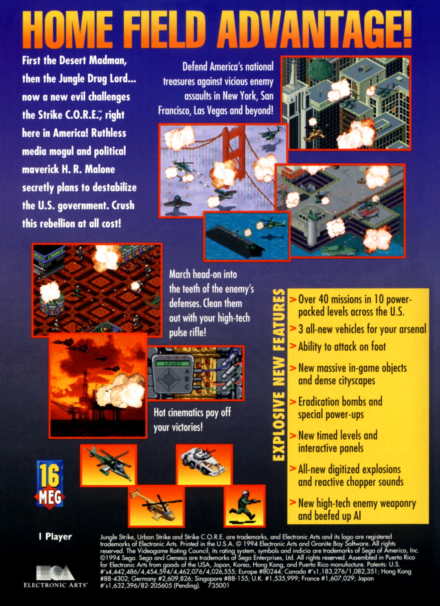 Take to the skies in a heavily armed attack helicopter in Urban Strike for the Sega Genesis. As a rogue pilot, it's your job to take on a twisted media mogul bent on world domination. This classic isometric action-shooter puts you in command of multiple vehicles, from the powerful Mohican helicopter to the versatile ground-based models. Navigate urban jungles and dangerous enemy territory, rescuing hostages, destroying targets, and surviving intense firefights. With its strategic gameplay and explosive action, this is a challenging and beloved entry in the classic "Strike" series.