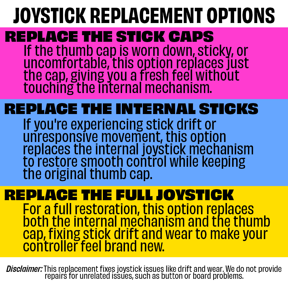 You may opt to just replace the internal joystick mechanism, just the plastic stick caps, or both. These are replaced with brand new replicas. Stick cap color may not match the original stick caps on your controller- in most cases, the stick cap will be black.