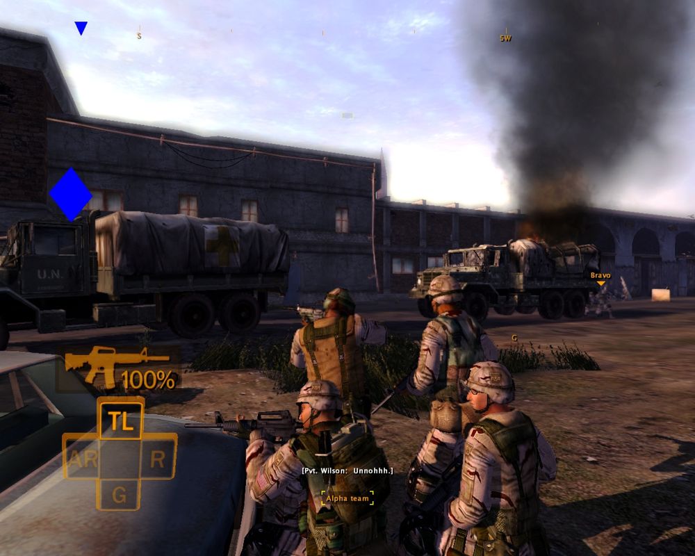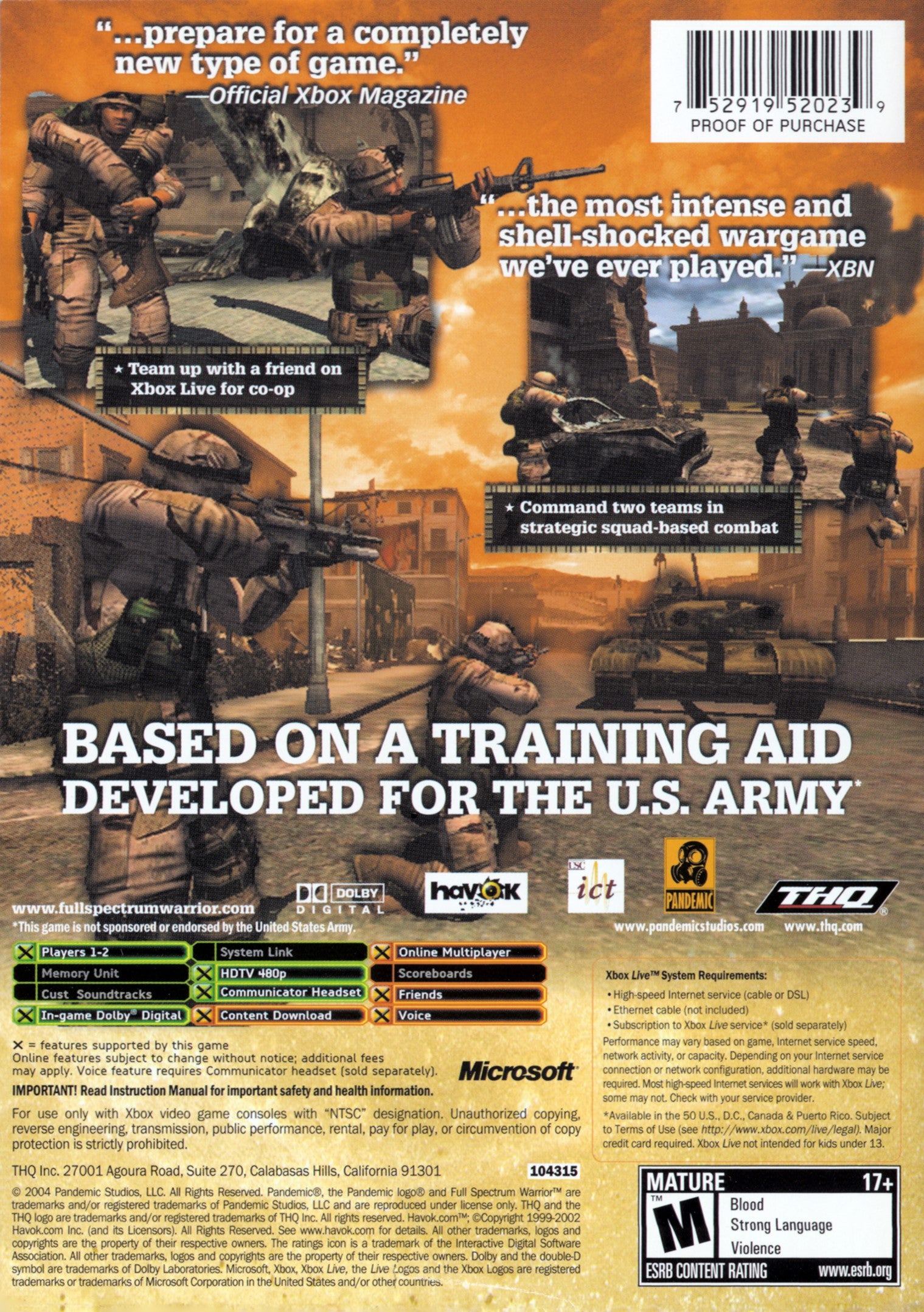 Command a squad of soldiers through intense urban combat in Full Spectrum Warrior for the Xbox. Based on U.S. Army training simulations, this unique tactical action game puts you in charge of two fireteams, issuing orders and maneuvering them through hostile environments. Suppress enemy positions, utilize cover, and execute precise squad-based tactics to complete your missions. Experience the challenges and responsibilities of modern infantry leadership.