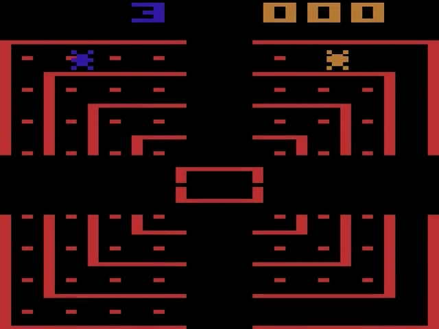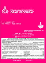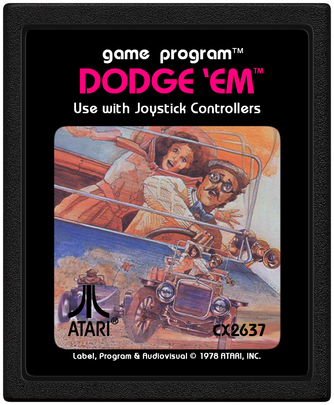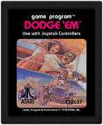 Dodge the enemy tanks and try to be the last one standing in Dodge 'Em for the Atari 2600. This simple yet addictive maze game pits you against a computer-controlled opponent. Navigate your car through the maze, collecting dots while avoiding crashes. It's a classic cat-and-mouse style game from the early days of home console gaming.