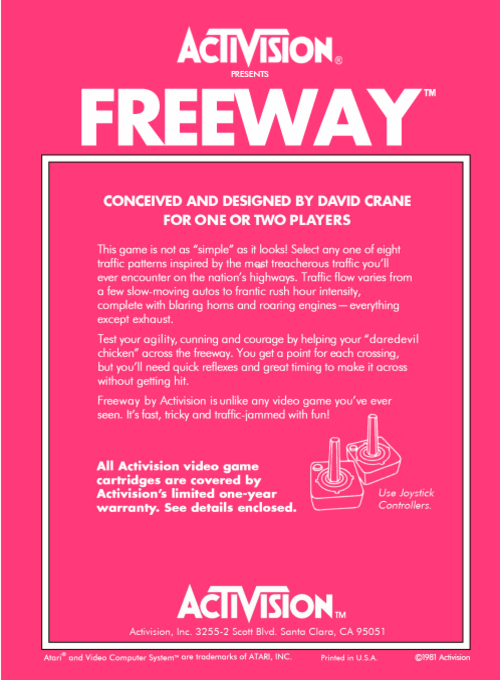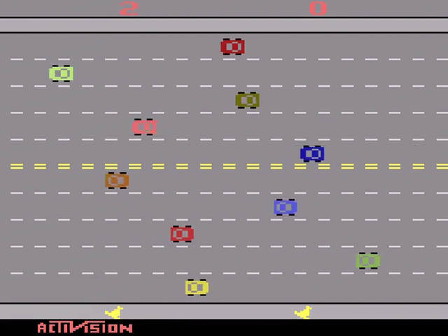 Brave the treacherous traffic in Freeway for the Atari 2600. As a plucky chicken, your singular goal is to cross a multi-lane highway teeming with speeding cars and trucks to reach the other side. Test your reflexes and timing as you dash through openings in the relentless flow of vehicles. It's a simple yet addictive classic that captures the perilous challenge of a daredevil crossing.