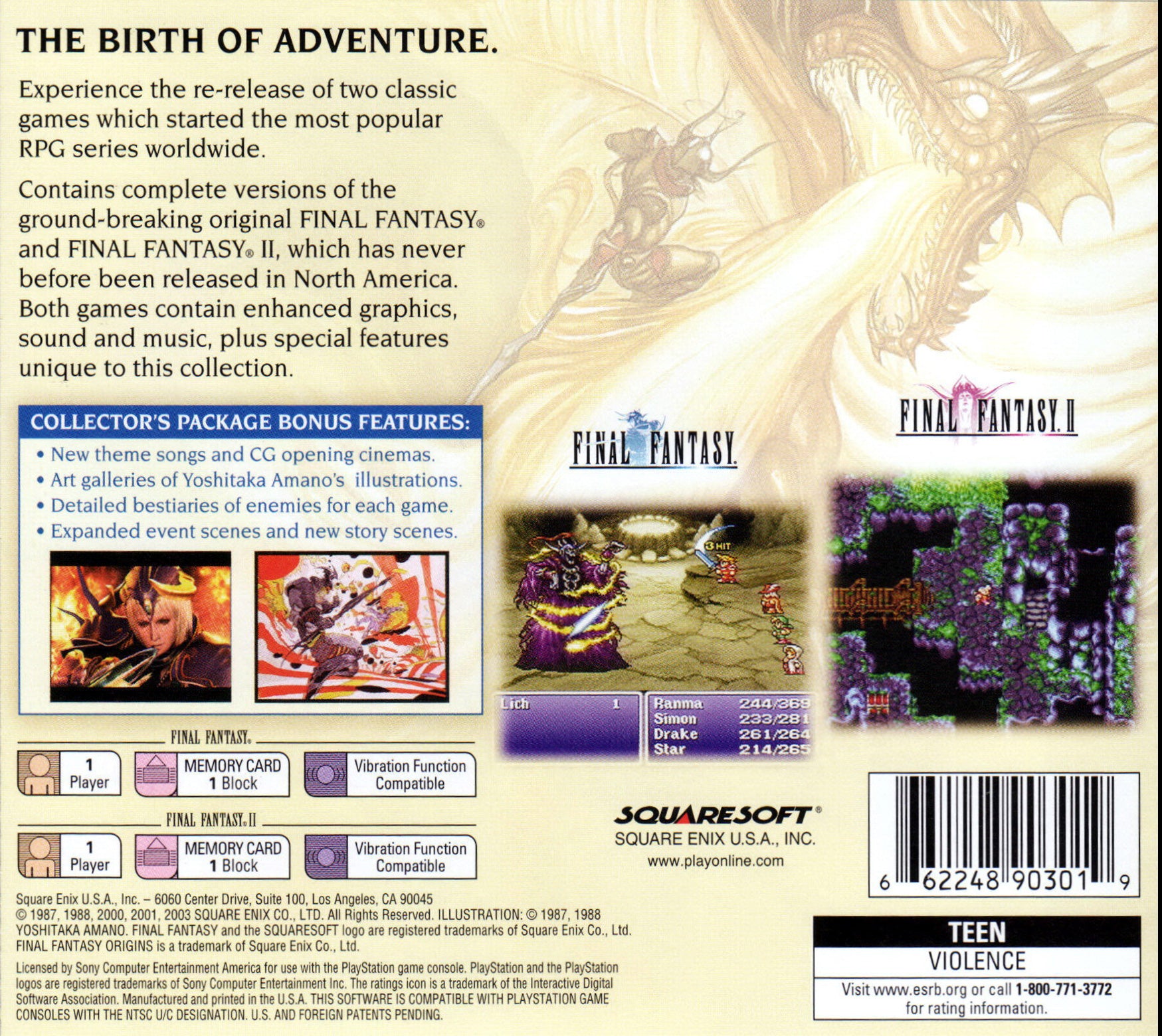 Return to where the legend began with Final Fantasy Origins for the PlayStation. This essential collection features remastered versions of the first two games that launched one of the most beloved RPG series of all time. Experience the original Final Fantasy, where you'll guide the four Warriors of Light on a quest to restore balance to the world. Then, dive into Final Fantasy II's innovative, skill-based progression system and its epic, character-driven story of an empire's rebellion. With updated graphics and sound, this is the perfect way to experience the foundational classics of role-playing history.