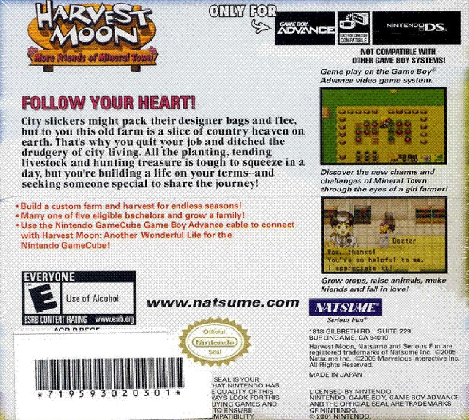 Return to the farm for a new life in Harvest Moon: More Friends of Mineral Town for the GameBoy Advance. This enhanced version of the farming simulation classic lets you play as a female protagonist, offering a fresh perspective on the beloved Mineral Town. Tending to your crops and livestock is just the beginning; you can also court and marry one of several bachelors, including new candidates like the gourmet judge and a kappa. The game features a new "Farming Degree" system to track your achievements, the ability to change your outfit, and plenty of new events and interactions with the townsfolk. With its charming graphics and addictive gameplay loop, this title offers the ultimate portable farming experience. Sow the seeds of romance and build the farm of your dreams.