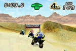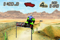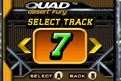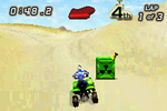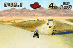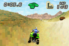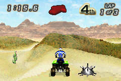 Tear up the desert terrain in Quad Desert Fury for the GameBoy Advance. This off-road ATV racing game challenges you to navigate treacherous desert landscapes, competing against rival racers across various challenging tracks. Master your quad bike's handling, utilize boosts strategically, and avoid obstacles to take the checkered flag. With its fast-paced arcade-style action and focus on aggressive off-road racing, Quad Desert Fury offers a fun and accessible portable experience for fans of ATV competitions and thrilling desert escapades.