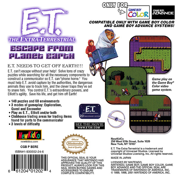 Help a beloved movie icon find his way home in E.T. the Extra-Terrestrial: Escape from Planet Earth for the GameBoy Color. This charming puzzle-adventure game lets you guide E.T. through a variety of levels as he tries to find the parts to build a communicator and phone home. Use E.T.'s special abilities like telekinesis and levitation to solve environmental puzzles, overcome obstacles, and avoid the government agents who are trying to capture him. It’s a delightful journey that captures the heart and wonder of the classic film, perfectly adapted for a handheld adventure.