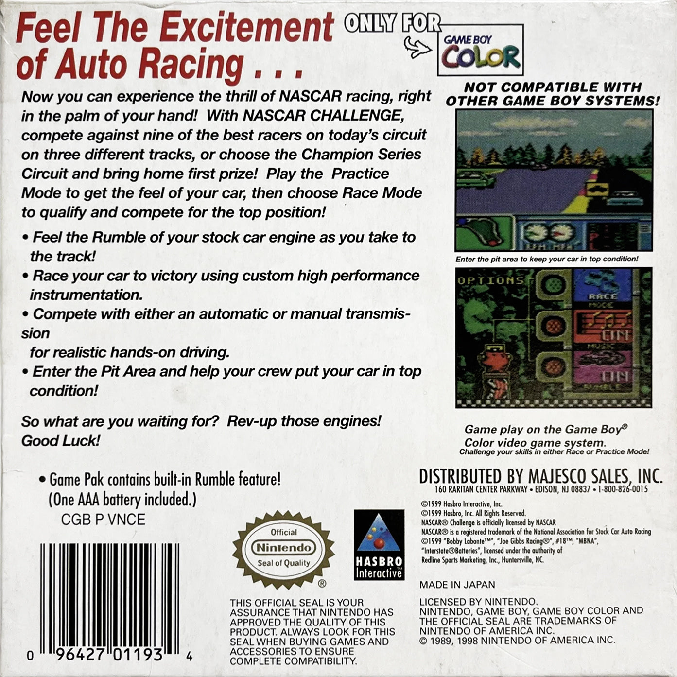 Start your engines and experience the thrill of stock car racing on the go. NASCAR Challenge for the GameBoy Color puts you in the driver's seat of powerful race cars on a variety of oval tracks and road courses. Choose your vehicle and compete against a pack of aggressive opponents, managing your speed and racing line to take the checkered flag. The game features a pseudo-3D perspective, allowing you to weave through traffic and draft behind rivals. Whether you are running a single exhibition race or competing for the championship cup, the need for speed is in your hands.