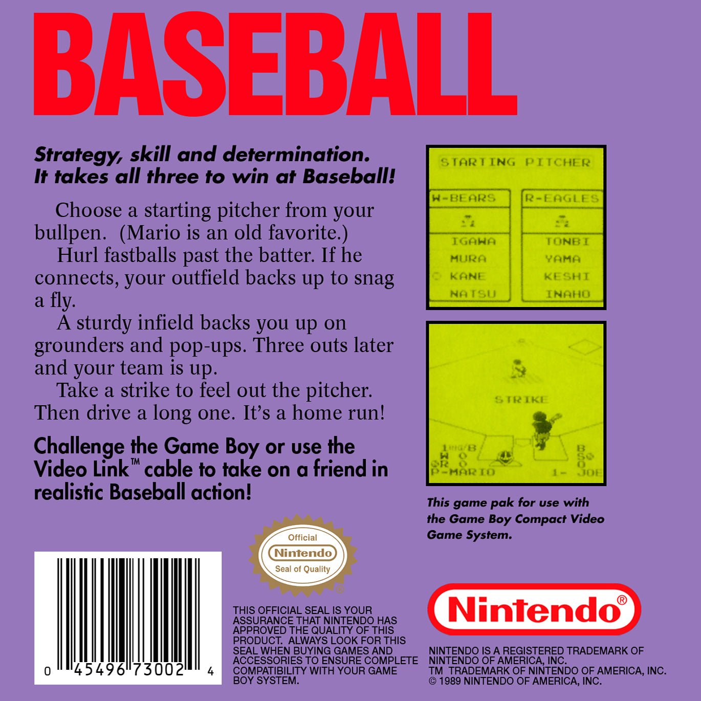 Experience the national pastime on the go with Baseball for the GameBoy. This classic handheld sports title delivers a straightforward and fun baseball simulation. Choose your team, step up to the plate, and swing for the fences. Pitch, bat, and field your way to victory in this simple yet surprisingly deep baseball game. It's a perfect slice of retro sports action that helped launch a handheld revolution.