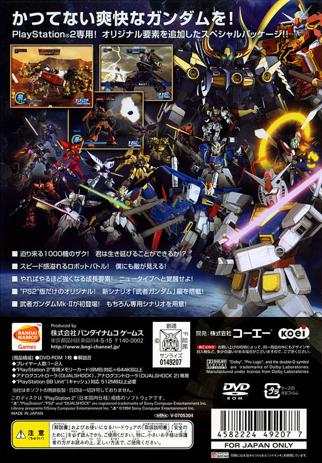 Pilot legendary mobile suits and dominate the battlefield in Gundam Musou Special for the JP Playstation 2. This action-packed title, also known as Dynasty Warriors: Gundam Special, combines the one-versus-one-thousand gameplay of the Musou series with the iconic world of Gundam. Select your favorite pilots and mechs from across the Universal Century and other timelines, then unleash devastating beam sabers, rifles, and special attacks upon entire armies. Live out your ultimate Gundam power fantasy by single-handedly turning the tide of massive interstellar wars.