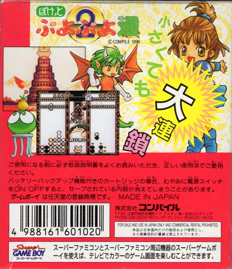 Get ready for some fast-paced, adorable, and addictive puzzle action with Puyo Puyo 2 for the JP GameBoy. This legendary puzzle game challenges you to connect four or more "Puyos" of the same color to clear them from your screen. The real fun begins when you master the art of chaining combos, sending disruptive "garbage" Puyos to your opponent's screen. With its simple to learn but hard to master gameplay, Puyo Puyo 2 offers endless replayability and frantic puzzle battles that will test your quick thinking and strategic planning.