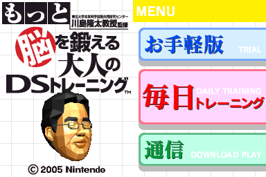 Train your brain with Brain Age: Train Your Brain in Minutes a Day! for the JP Nintendo DS. This is the original Japanese release of the revolutionary puzzle game that started a global phenomenon. Engage in a variety of quick, fun mini-games designed to stimulate your mind and calculate your "brain age." This import version is primarily in Japanese.