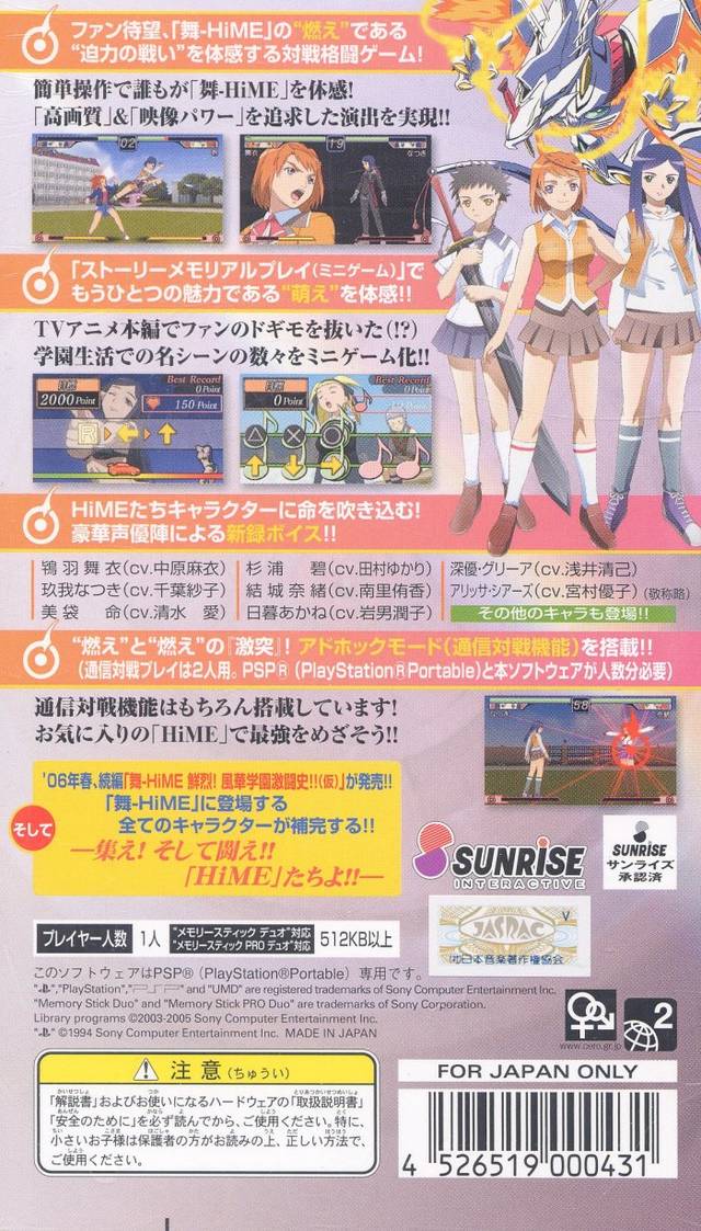 Battle for supremacy at Fuuka Academy in Mai-HiME: Bakuretsu! Fuuka Gakuen Gekitoushi?!, a 3D fighting game and Japanese import for the PSP. Based on the hit anime series Mai-HiME, this game lets you choose your favorite magically-gifted student and engage in fast-paced arena combat. Unleash each character's unique elemental powers, special moves, and summon their powerful Guardians, known as Children, to turn the tide of battle. Fans of the anime will love seeing the characters and their abilities faithfully recreated in this action-packed fighter. Pick your HiME and prove you are the strongest in the academy.