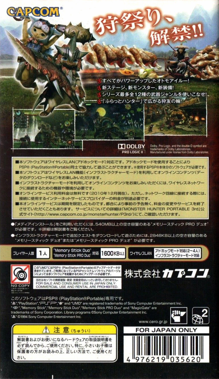 Immerse yourself in the distinct Eastern-themed aesthetics of Yukumo Village in Monster Hunter Portable 3rd for the JP PSP. This best-selling action RPG streamlines the hunting experience while introducing a host of new monsters, including the electrifying wolf wyvern, Zinogre. Players can explore lush new environments, soak in the village hot springs for buffs, and utilize an expanded Felyne armor system to customize their AI companions. With refined weapon mechanics—including the fluid Switch Axe—and a vibrant, polished art style, this Japanese import offers a unique chapter in the franchise that stands apart from its predecessors, delivering thrilling co-op action and addictive crafting loops.