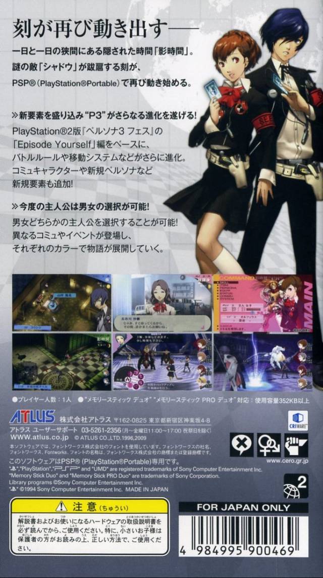 Experience the Dark Hour and balance high school life with supernatural combat in Persona 3 Portable for the JP PSP. This critically acclaimed role-playing game reinvents the genre-defining classic for handheld play, introducing a new female protagonist option that alters social interactions and offers a fresh perspective on the story. By day, you will build bonds with classmates through Social Links and navigate the trials of student life; by night, you will summon powerful Personas to battle Shadows in the towering dungeon of Tartarus. Featuring a stylish visual novel interface, direct party control in battle, and a masterful soundtrack, this Japanese import delivers an unforgettable, emotionally charged JRPG journey.