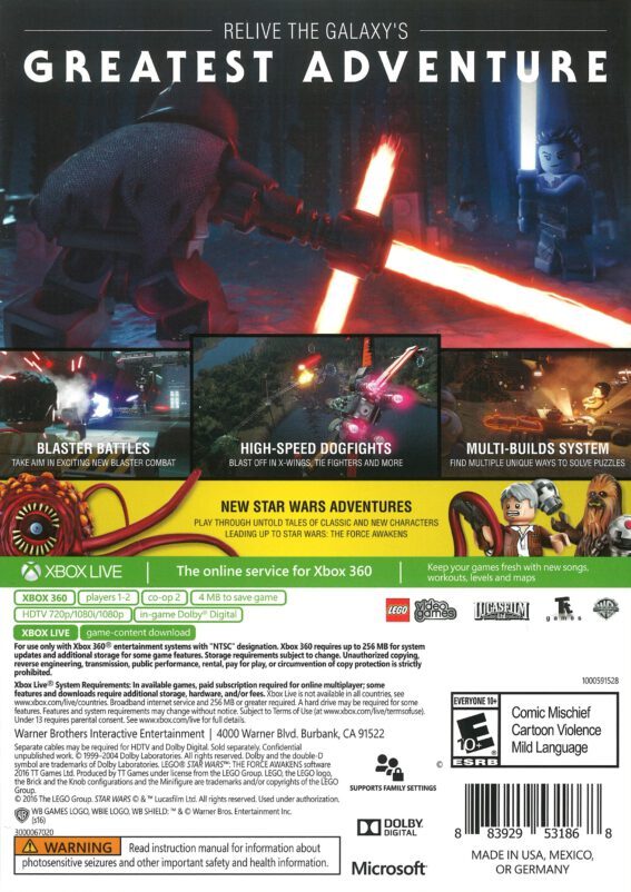 The Force awakens on your console in LEGO Star Wars: The Force Awakens for the Xbox 360. Relive the epic story of the blockbuster film with a charming and humorous LEGO twist. Play as Rey, Finn, Poe Dameron, BB-8, Kylo Ren, and Han Solo in this action-packed adventure. The game introduces new mechanics like Blaster Battles, where you use cover to engage in intense firefights, and Multi-Builds, which allow you to solve puzzles in different ways. With all the wit and charm of a LEGO game, it's a fantastic journey for Star Wars fans of all ages.