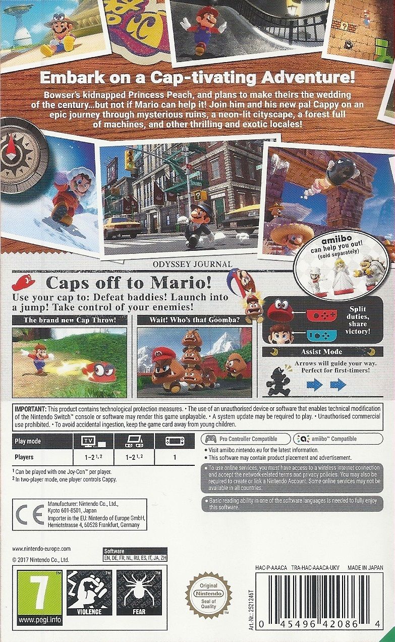Embark on a globe-trotting adventure to save Princess Peach in Super Mario Odyssey for the PAL Nintendo Switch. This critically acclaimed 3D platformer introduces Cappy, Mario's new hat companion, who allows you to capture and control objects, animals, and enemies. Explore massive, open-ended Kingdoms filled with secrets, from the bustling streets of New Donk City to the prehistoric Cascade Kingdom. Collect Power Moons to power up the Odyssey airship and chase Bowser to the moon. Featuring creative sandbox gameplay, stunning visuals, and a catchy soundtrack, this is a defining experience for the console. Please note this is the PAL version, which is compatible with Nintendo Switch systems worldwide. Jump in and experience the evolution of Mario.