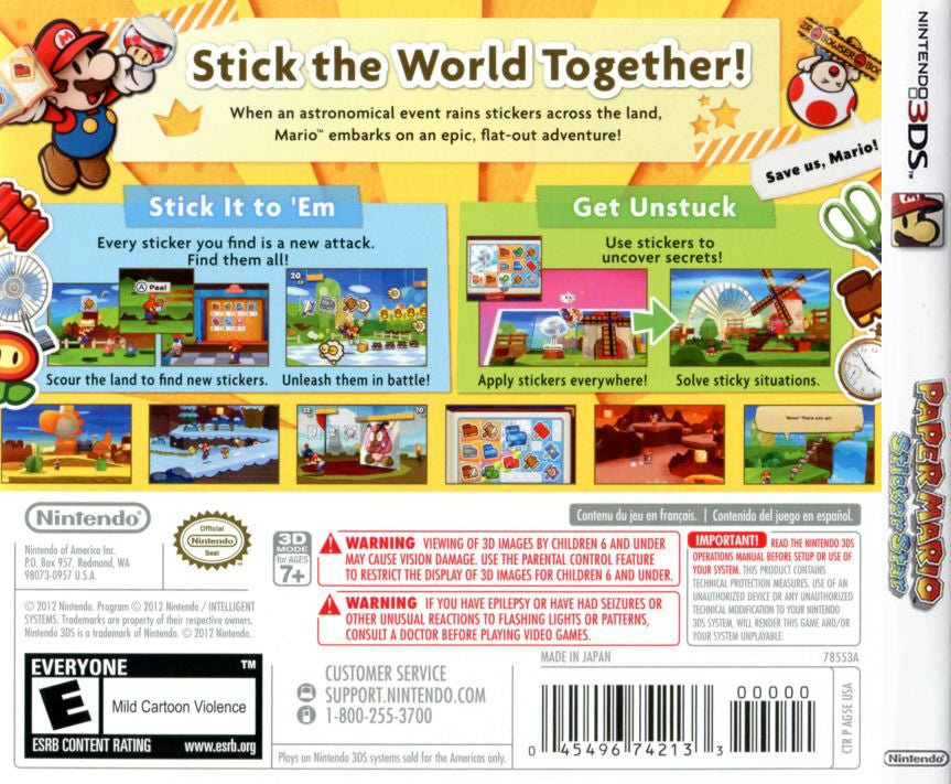 Join Mario on a sticker-filled quest in Paper Mario: Sticker Star for the Nintendo 3DS. When Bowser shatters the Sticker Comet, it's up to Mario and his helpful companion Kersti to retrieve the powerful Royal Stickers scattered across the Mushroom Kingdom. Utilize a variety of collectible stickers in turn-based battles to attack enemies and solve environmental puzzles. Explore diverse papercraft worlds, discover hidden secrets, and experience a charming adventure with a unique sticker-based gameplay mechanic, all presented in vibrant 3D.