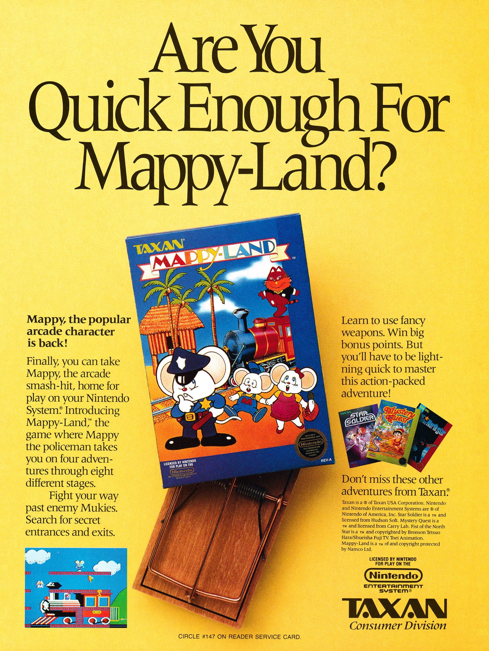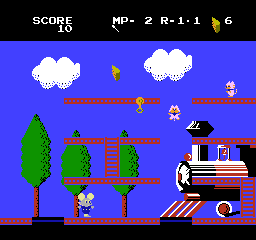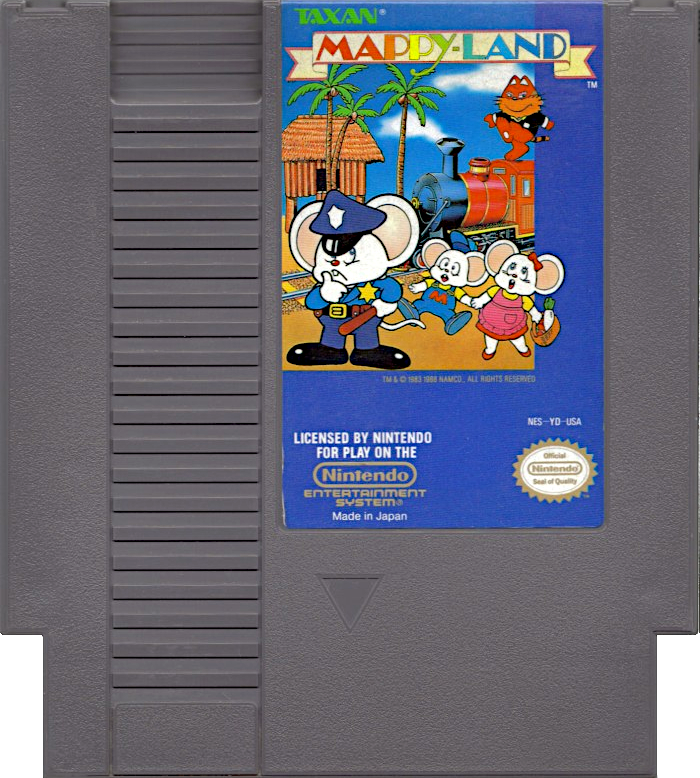 Guide Mappy the police mouse through a mansion full of thieving cats in Mappy-Land for the NES. This charming action-platformer sees Mappy navigating various themed lands, collecting specific items while avoiding Goro and his feline gang. Utilize trampolines, doors, and other environmental elements to outsmart your pursuers and complete each stage. It’s a delightful and engaging retro title with a catchy soundtrack.