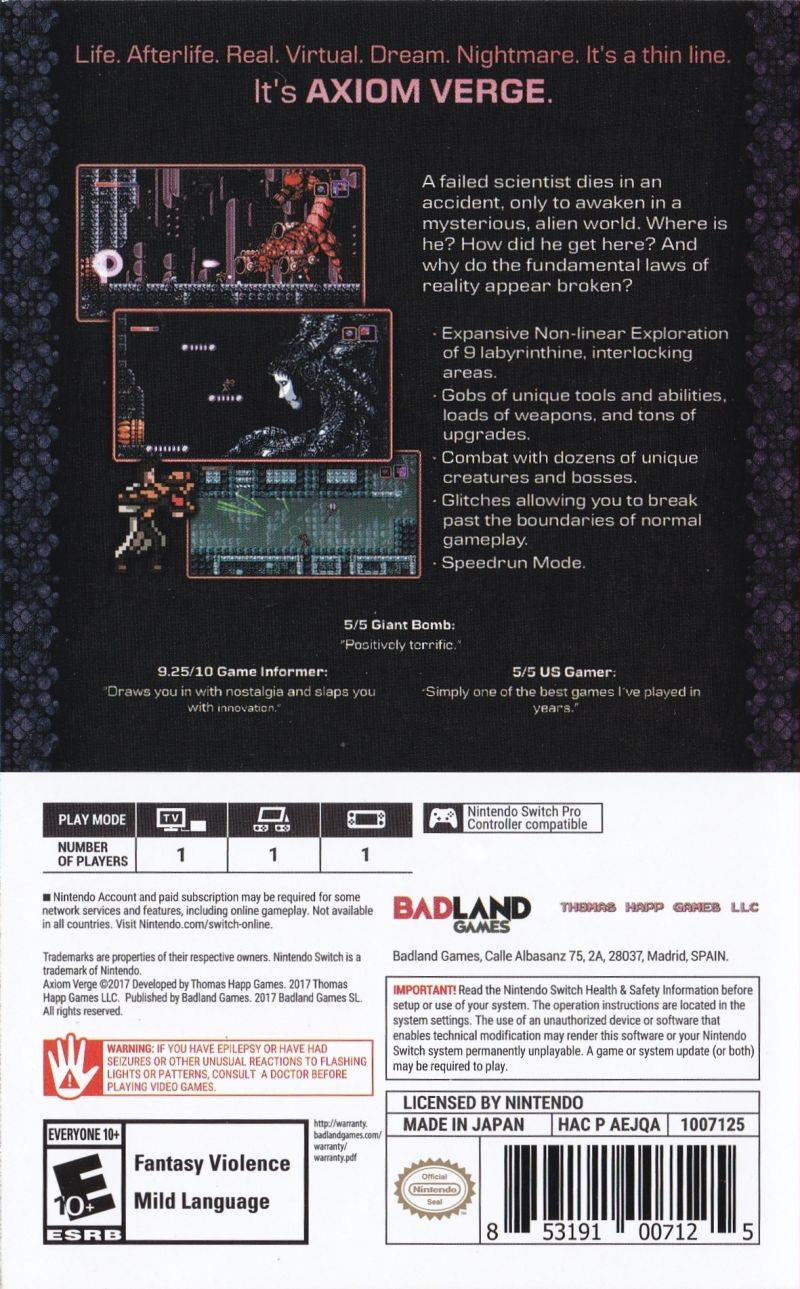 Dive into a massive, mysterious, interconnected alien world in Axiom Verge for the Nintendo Switch. This acclaimed indie title is a pure, modern interpretation of the Metroidvania genre, focused entirely on exploration and uncovering secrets. You play as a scientist who awakens on a bizarre, high-tech planet, armed only with a gun and a powerful curiosity. Discover over 20 unique weapons and more than 30 abilities and upgrades, using them to unlock new pathways and break the fundamental laws of reality through the unique Address Disruptor tool. Experience non-linear progression, challenging boss battles, and a captivating sci-fi story that is perfect for on-the-go exploration on the Switch.