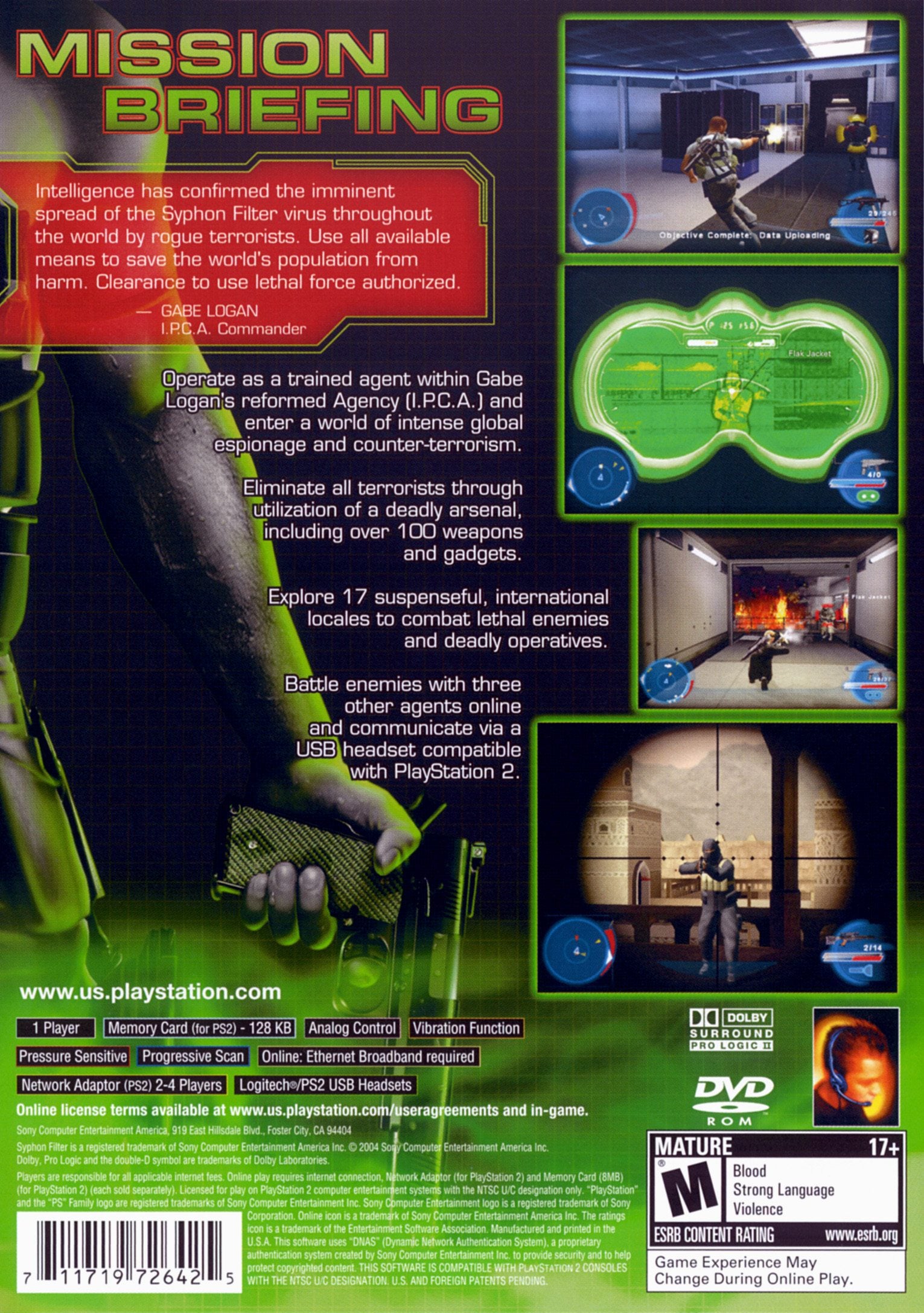 Confront a new global threat with the Agency's most elite operative in Syphon Filter: Omega Strain for the Playstation 2. For the first time in the series, create your own customizable agent and team up with other players online (service may be discontinued) or AI companions to battle the deadly Omega Strain virus and the international terrorists who wield it. Explore vast levels, utilize a wide array of weaponry and gadgets, and complete challenging mission objectives. Omega Strain focuses on cooperative multiplayer action while retaining the series' signature stealth and tactical combat elements.