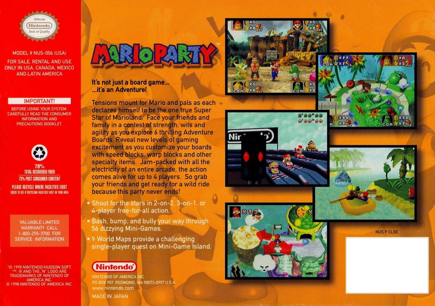 The original party starter is here with Mario Party for the Nintendo 64. Join Mario and his friends as they compete across whimsical game boards to collect the most stars. Land on spaces to trigger a huge variety of hilarious and challenging mini-games that test your skill, luck, and button-mashing prowess. With its engaging four-player action, Mario Party defined a new genre of multiplayer fun.