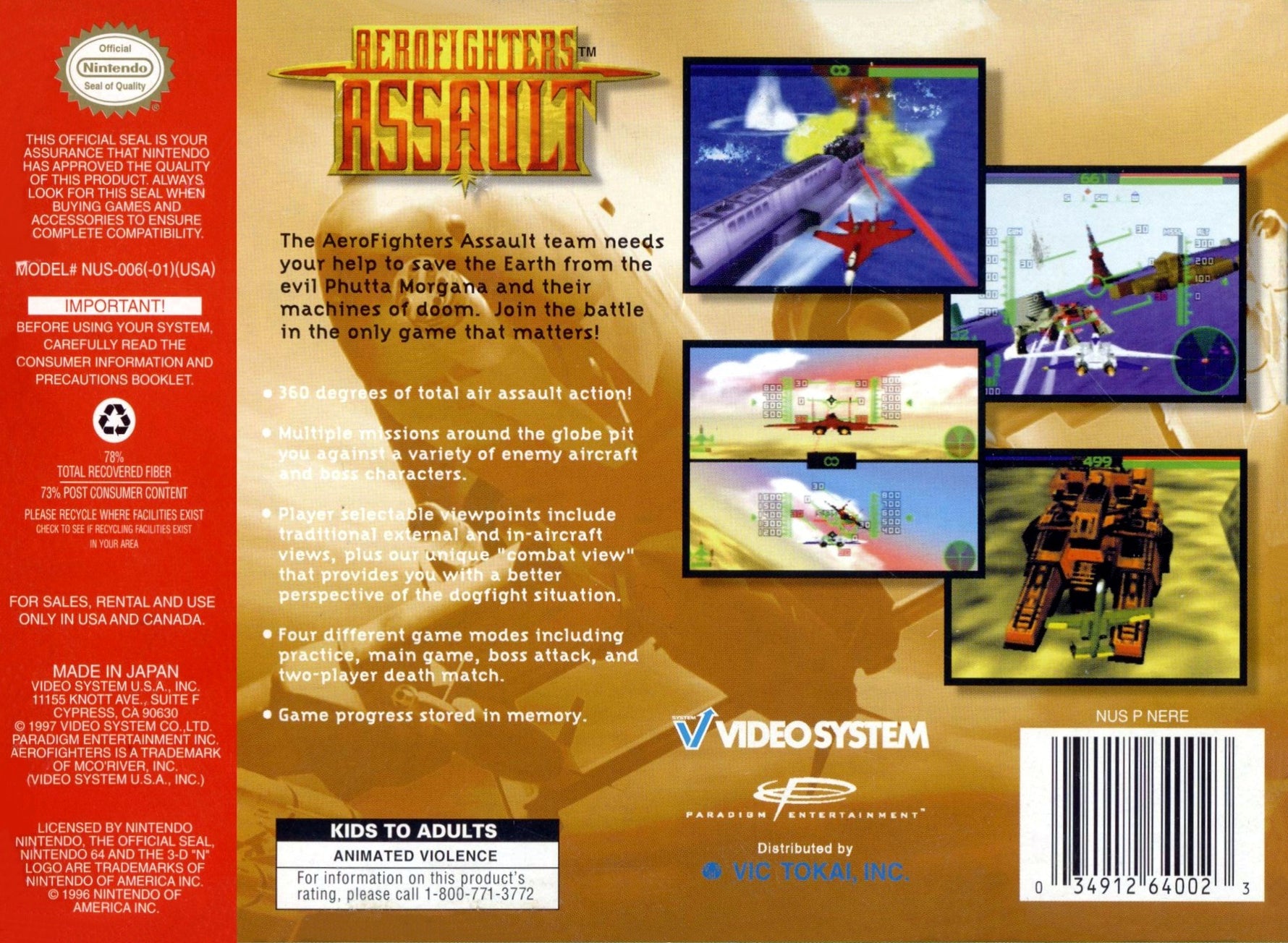 Take to the skies in intense aerial combat with AeroFighters Assault for the Nintendo 64. Choose from a roster of unique pilots and their distinct fighter jets, each with special weapons and abilities. Engage in thrilling dogfights against enemy aircraft and massive bosses across diverse missions. With its arcade-style gameplay and focus on action, AeroFighters Assault delivers a challenging and exciting flight combat experience.