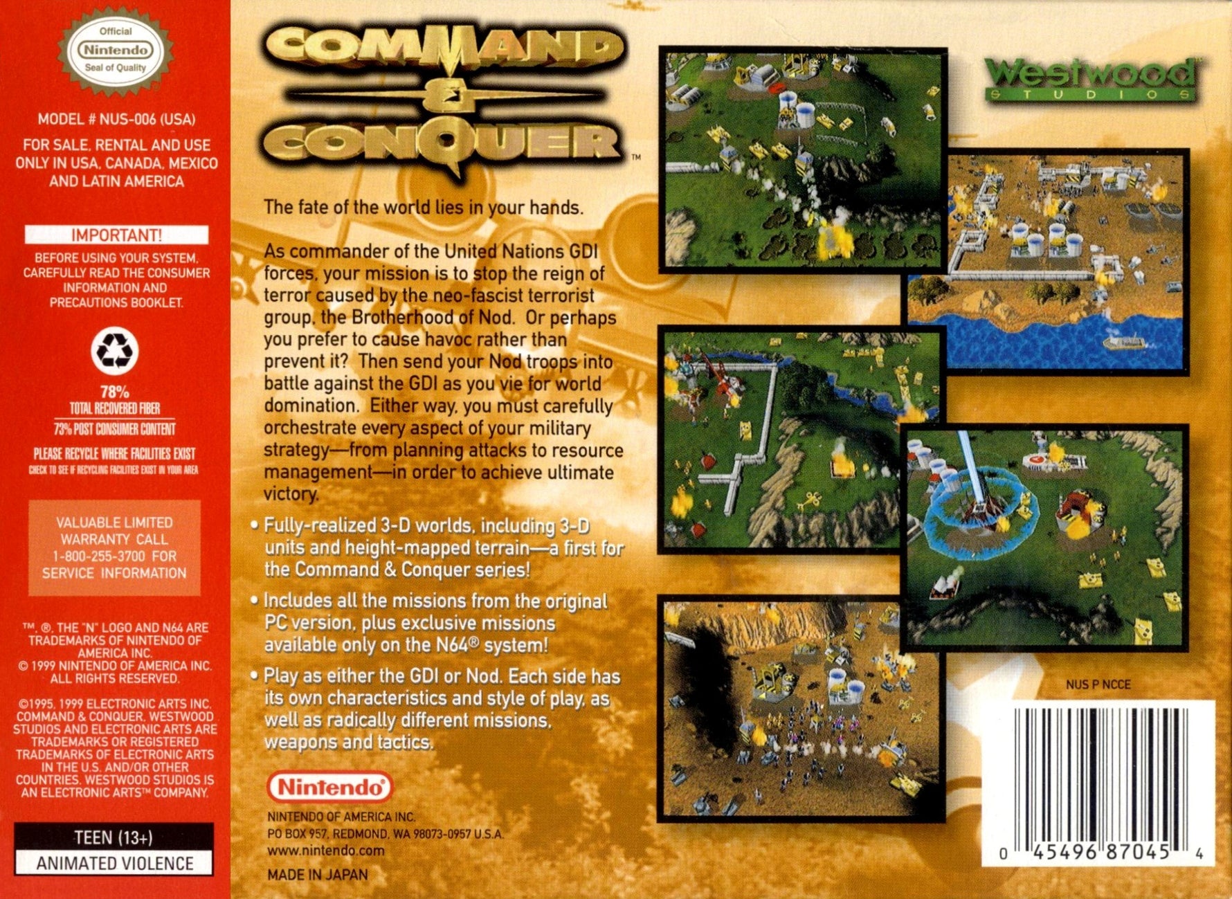 The battle for Tiberium begins on a new front in Command & Conquer for the Nintendo 64. This console adaptation of the groundbreaking real-time strategy game lets you choose between the Global Defense Initiative (GDI) and the Brotherhood of Nod. Build your base, harvest resources, and command a variety of futuristic military units to crush your enemy. It's a classic RTS experience, adapted for the N64 controller.