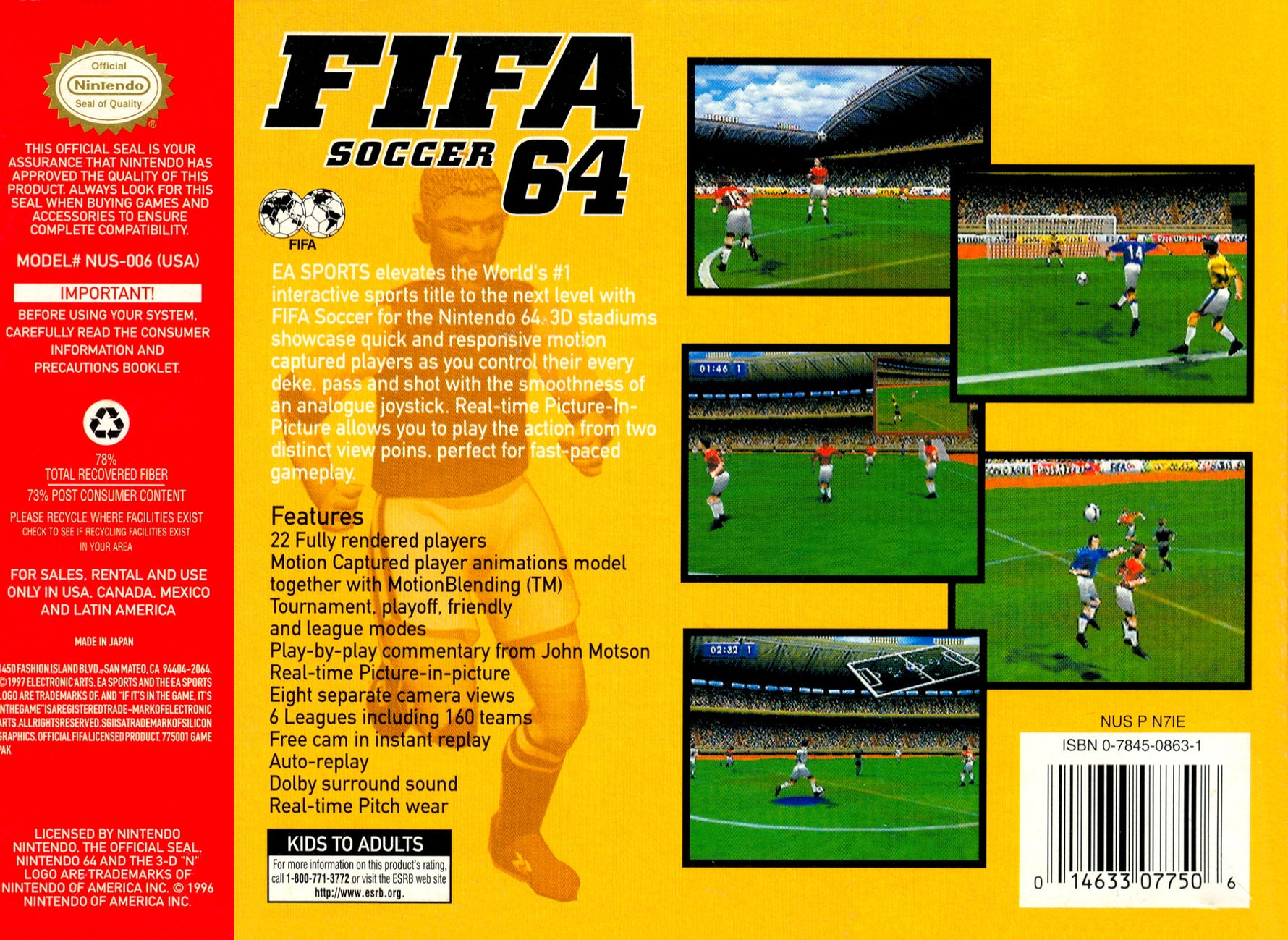 Experience early 3D soccer action with FIFA Soccer 64 for the Nintendo 64. Take control of international teams and compete for global supremacy on the virtual pitch. Featuring polygonal players and various camera angles, this title brought a new dimension to the FIFA series. Utilize different formations, make strategic substitutions, and master the controls to score spectacular goals and lead your nation to victory in this pioneering 3D football game.