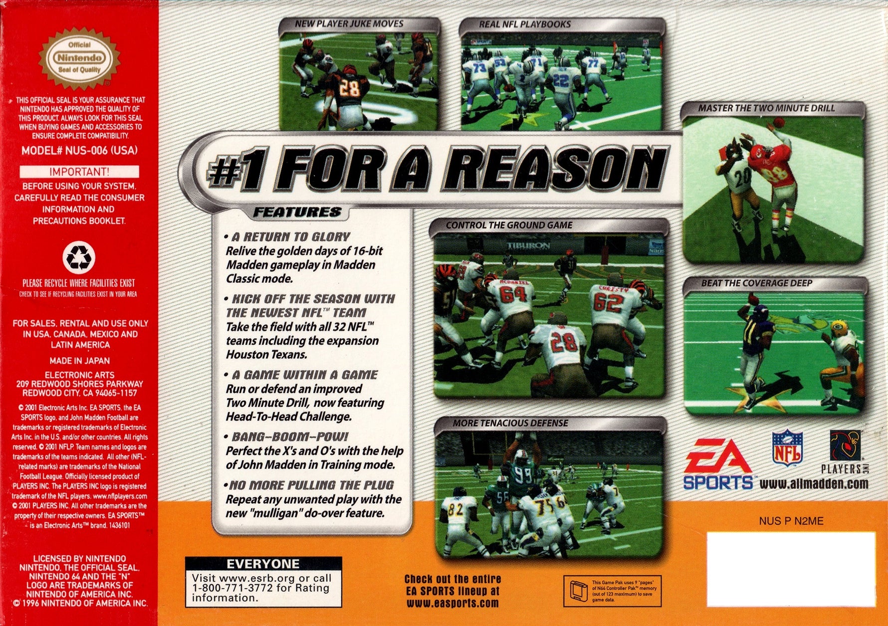 The tradition of gridiron excellence continues with Madden NFL 2002 for the Nintendo 64. Take control of your favorite NFL teams and players, experiencing refined gameplay mechanics and updated rosters for the 2001 season. Execute complex offensive plays, make crucial defensive stops, and lead your team through a challenging season mode. This classic installment offers deep football simulation for fans of the sport.