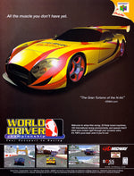 Challenge the world's best drivers and master demanding circuits in World Driver Championship for the Nintendo 64. This sophisticated racing simulation features an extensive lineup of accurately modeled real-world GT cars and a variety of challenging international tracks. Progress through different tiers of high-stakes competition, earn prize money to upgrade your vehicles and improve their performance, and master the nuances of precise driving physics. Renowned for its realistic handling model and impressive graphics for the N64 platform, this title offers a deep, rewarding, and authentic experience for serious racing game aficionados.