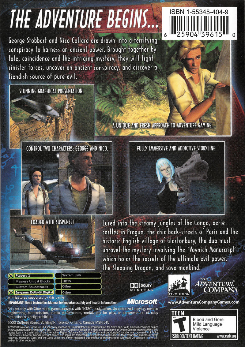 Embark on a dark and gritty quest in Broken Sword: The Sleeping Dragon for the Xbox. This 3D adventure game continues the story of George Stobbart and Nico Collard as they unravel a new global conspiracy. Explore detailed environments, solve complex puzzles, and interact with a cast of memorable characters. This installment introduces direct control over the characters, adding a new dimension to the classic point-and-click formula.