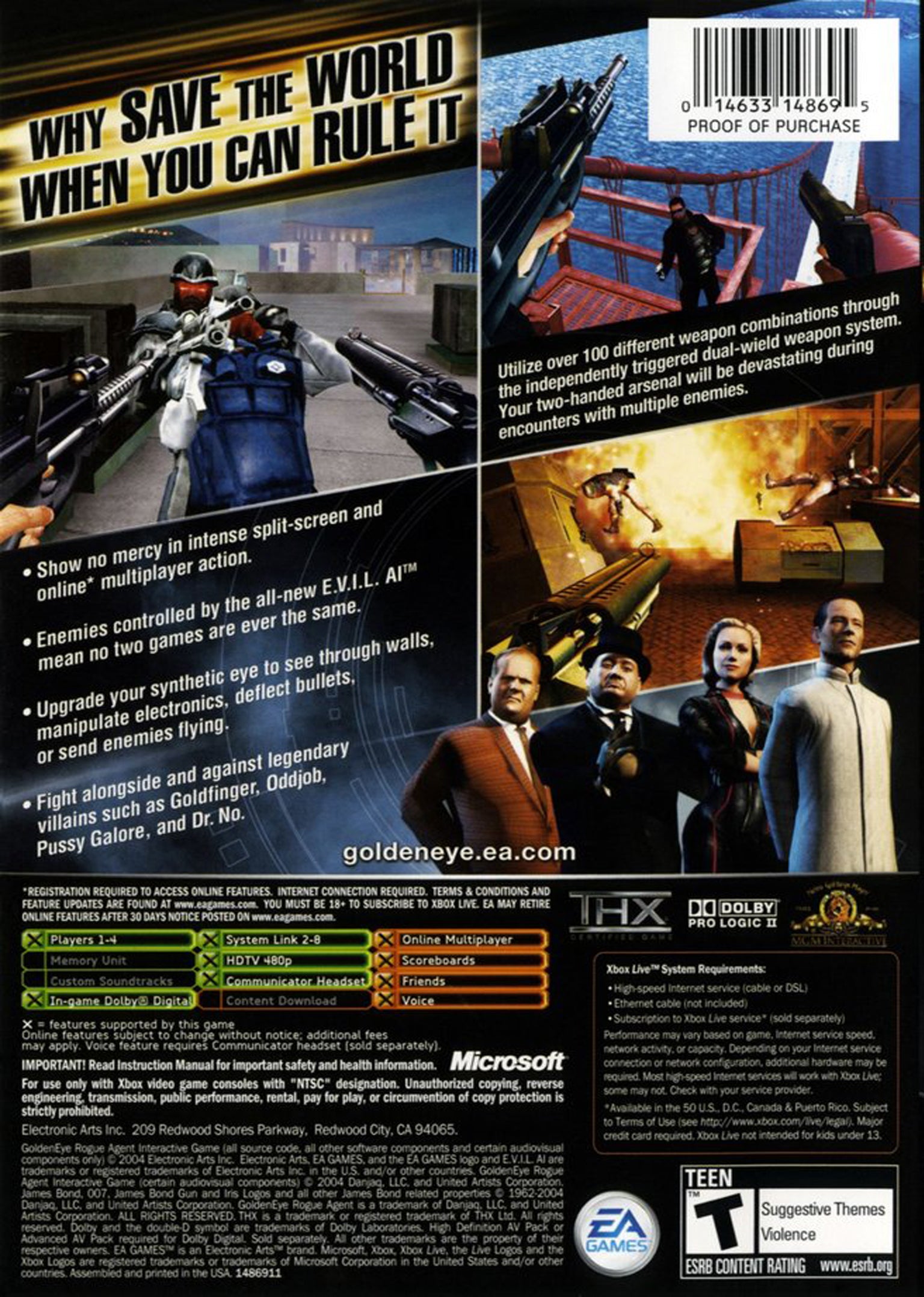 Step into the shoes of a rogue 00 agent in GoldenEye: Rogue Agent for the Xbox. Betrayed by MI6, you are recruited by Auric Goldfinger to wage war against Dr. No. Wield a customizable synthetic "golden eye" with powerful abilities, engage in intense first-person shooter combat, and battle alongside and against iconic Bond villains. Experience a darker, more brutal take on the world of James Bond.