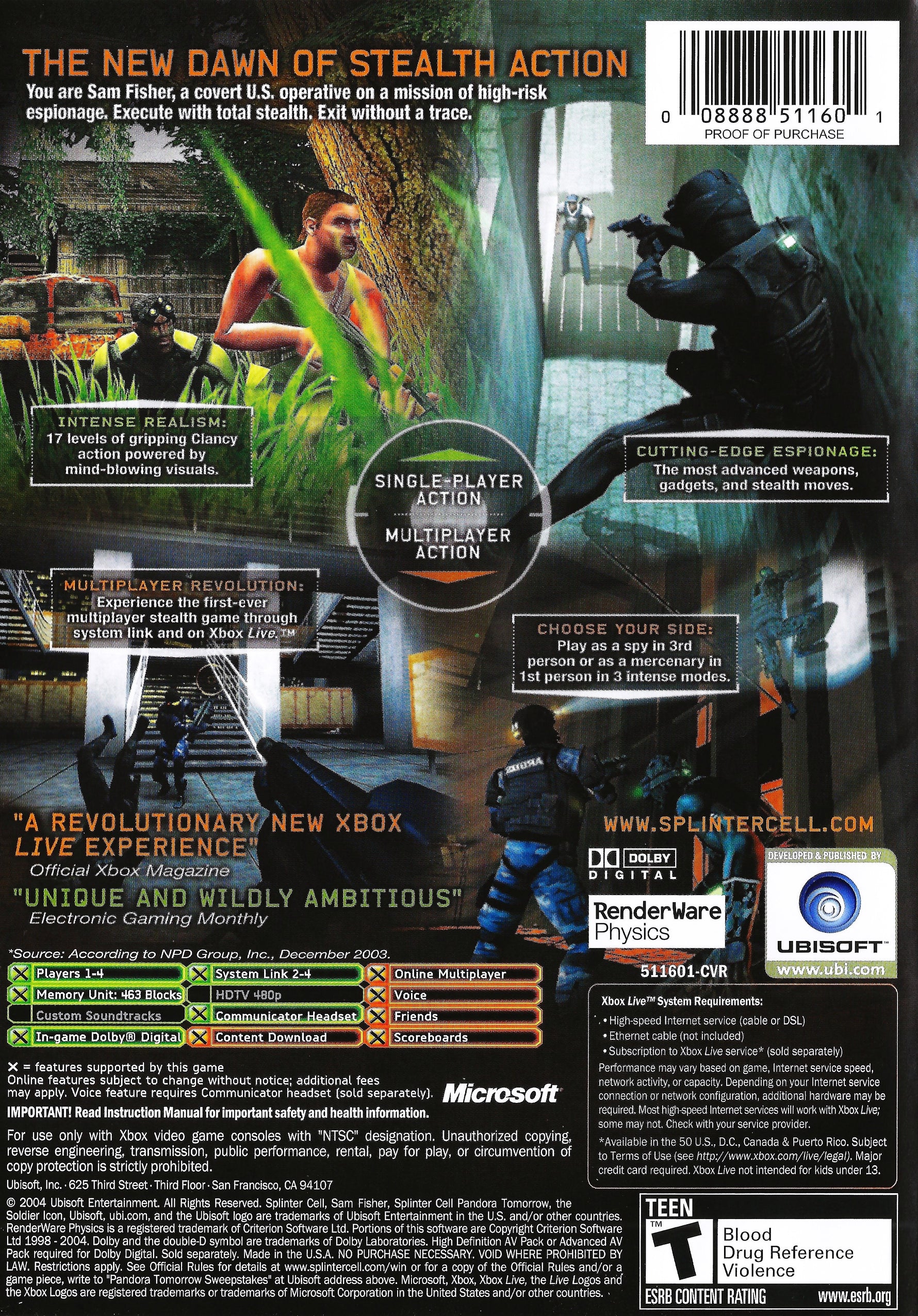 Infiltrate hostile territories and prevent a global catastrophe in Tom Clancy's Splinter Cell: Pandora Tomorrow for the Xbox. As elite operative Sam Fisher, you must stop an Indonesian guerrilla leader from unleashing a devastating bioweapon on American soil. This acclaimed sequel features enhanced stealth mechanics, new high-tech gadgets, and more dynamic, interactive environments. The Xbox version boasted superior graphics and lighting effects, and introduced groundbreaking adversarial multiplayer, pitting agile Spies against powerful, heavily armed Mercenaries in tense online encounters, setting a new standard for online tactical stealth.