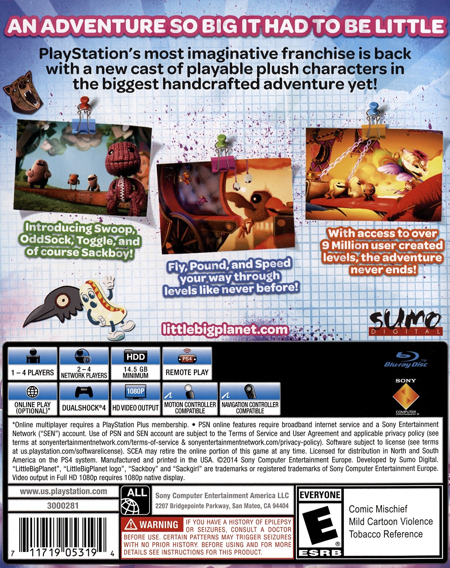 Play, Create, and Share in the imaginative world of LittleBigPlanet 3 for the Playstation 4. Join Sackboy on his biggest adventure yet, alongside a charming cast of new playable heroes: the swift OddSock, the size-shifting Toggle, and the soaring Swoop. Use their unique abilities to explore a vibrant world and stop the nefarious Newton. The real magic lies in the deep and intuitive Create Mode, where you can design your own levels and games to share with a global community. LittleBigPlanet 3 is a boundless platforming adventure powered by your own creativity.
