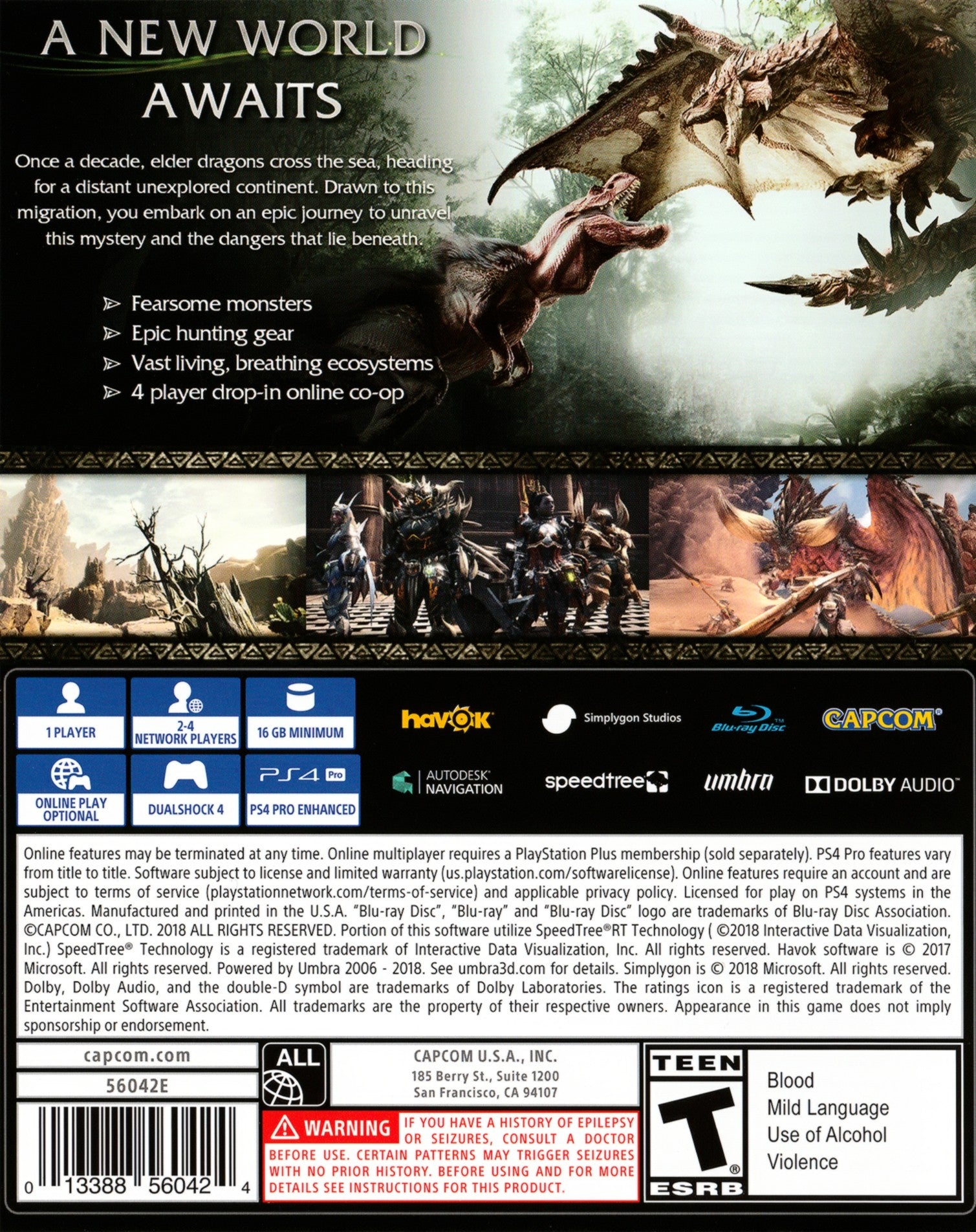 Journey to a new world and become a legendary hunter in Monster Hunter: World for the PlayStation 4. This critically acclaimed action RPG features a vast, seamless ecosystem teeming with ferocious monsters. Track your prey, utilize the environment to your advantage, and engage in thrilling, strategic combat. Craft powerful weapons and armor, and team up with friends in online co-op to take down the most dangerous beasts.