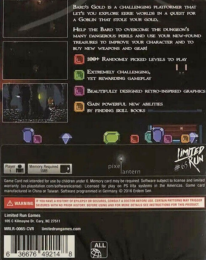 Prepare for a brutally challenging, retro-inspired adventure with Bard's Gold for the Playstation Vita. This 2D action-platformer will test your skills and your patience as you navigate deadly, procedurally generated levels. When the goblin hordes steal your family's treasure, you embark on a quest to get it back. With no checkpoints and permadeath, every jump and attack must be precise. Collect gems to purchase powerful upgrades that will aid you on subsequent runs. For fans of classic, hardcore platformers, this is a treasure worth seeking.