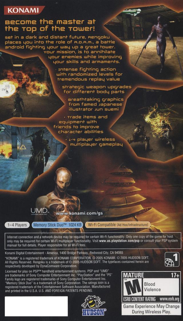 Battle your way through a desolate, mechanical purgatory in Rengoku: The Tower of Purgatory for the PSP. As A.D.A.M., an android warrior, you must ascend a formidable tower, fighting other sentient machines to survive and uncover the truth behind your existence. This action RPG features intense real-time combat, extensive character customization by equipping various body parts and weapons scavenged from fallen foes, and randomly generated dungeon floors. With its dark, futuristic setting and challenging gameplay, Rengoku offers a unique and engaging portable hack-and-slash experience.