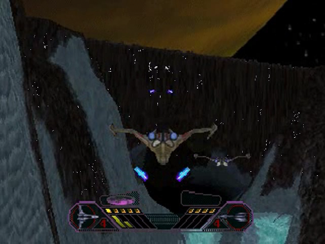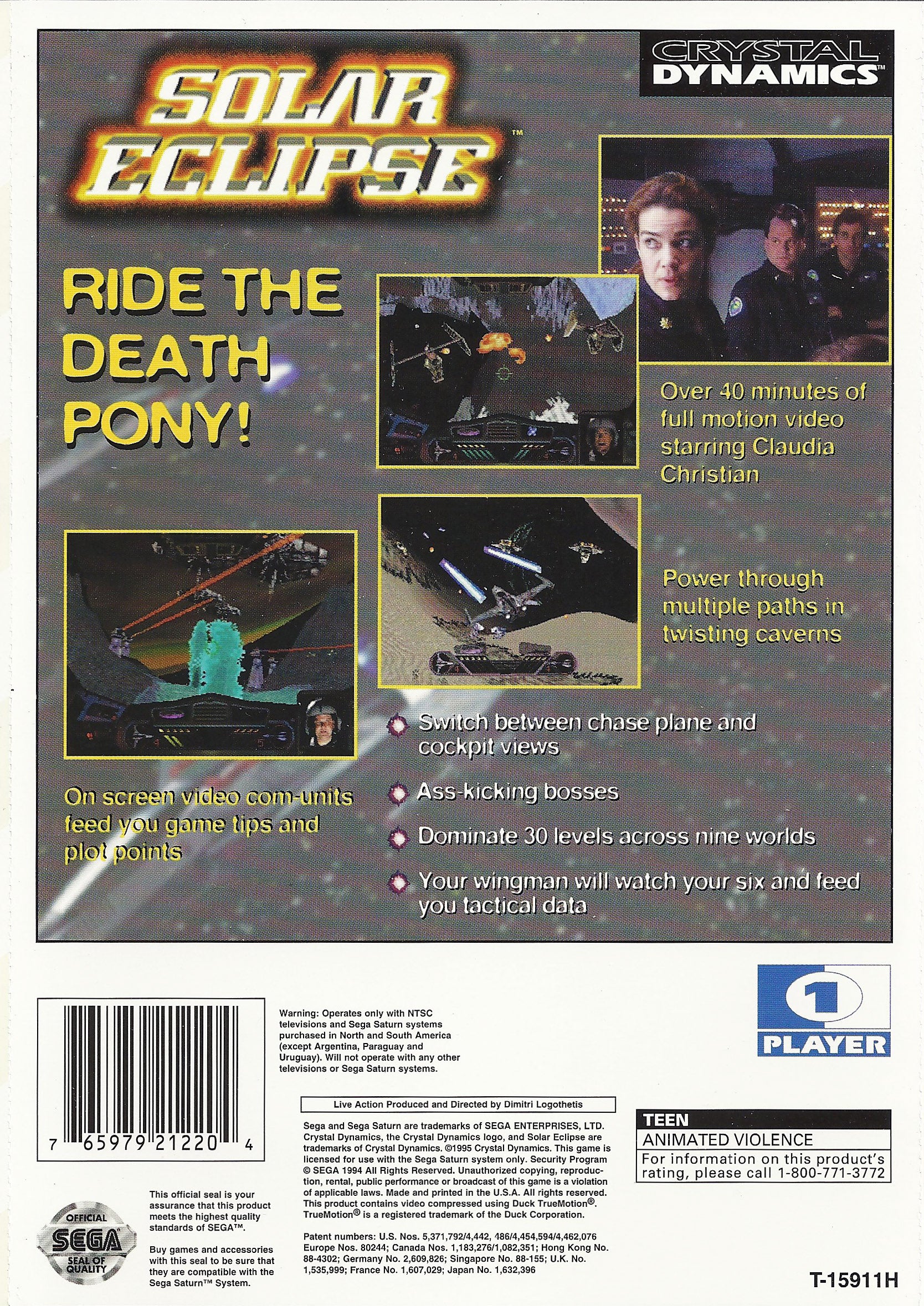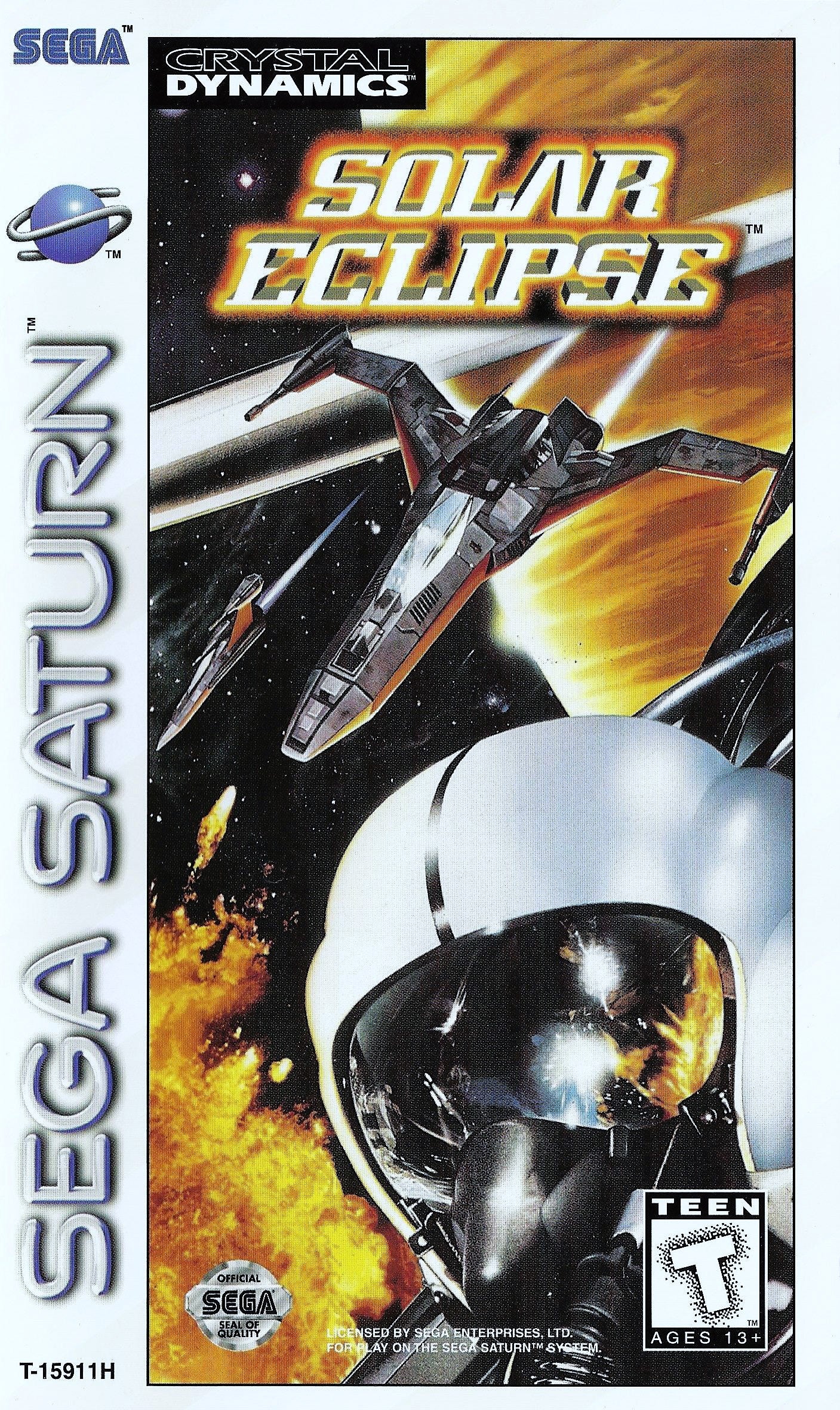 Strap into the cockpit for a cinematic sci-fi dogfight in Solar Eclipse for the Sega Saturn. This game is a 3D on-rails shooter that pushes you through action-packed levels filled with enemy ships, massive capital ships, and treacherous asteroid fields. As a pilot for a strategic defense team, you must fly through vibrant and diverse planetary environments to repel an alien invasion. The gameplay is fast-paced and accessible, focusing on intense shooting action and navigating hazardous terrain. With its full-motion video cutscenes and constant radio chatter from your wingmen, Solar Eclipse delivers a classic, story-driven arcade shooter experience.