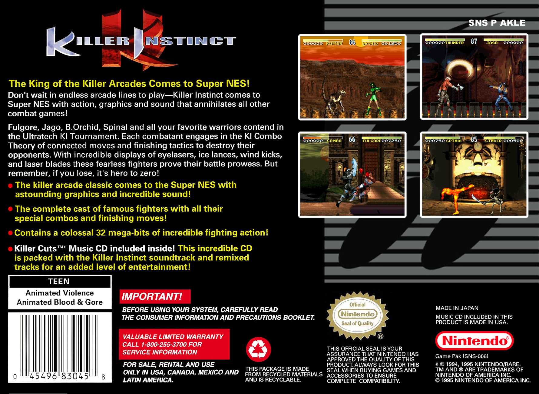 Unleash brutal combos and primal fury in Killer Instinct for the Super Nintendo, a legendary fighting game known for its fast-paced action and unique characters. Choose from a diverse roster of fighters, including a werewolf, a dinosaur, and a cyborg, each with their own devastating special moves and "Ultra Combos." Battle your way through a challenging arcade mode or go head-to-head against a friend in this iconic and visceral 2D fighter. Get ready for a C-C-C-COMBO BREAKER!