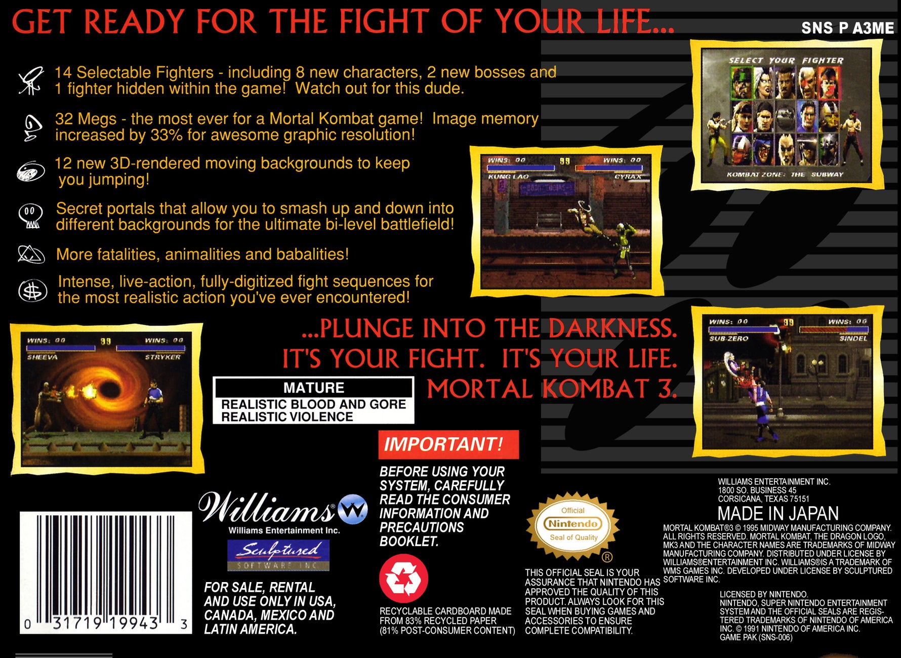 Finish him! The ultimate 16-bit fighting experience arrives in Mortal Kombat 3 for the Super Nintendo. Shao Kahn has invaded Earthrealm, and it's up to you to stop him. Choose from a massive roster of new and returning kombatants, each with their own unique set of special moves and brutal finishing maneuvers. This classic arcade fighter introduces the ability to run and chain together devastating combos for the first time in the series. With its iconic characters, fast-paced gameplay, and unforgettable action, Mortal Kombat 3 is an essential title for any fan of the fighting game genre.