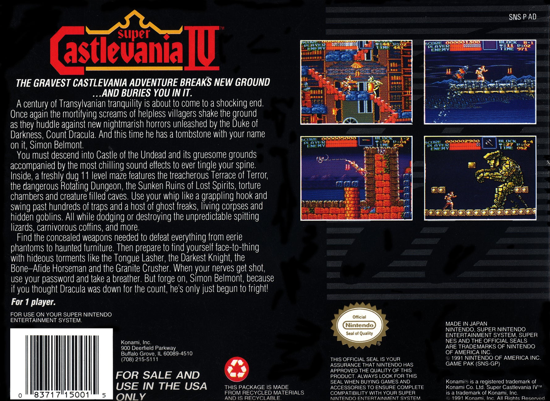 Wield the legendary Vampire Killer whip and battle the forces of darkness in Super Castlevania IV for the Super Nintendo. As Simon Belmont, you must once again confront Dracula in his haunted castle. This critically acclaimed action-platformer features incredible 16-bit graphics, an atmospheric soundtrack, and refined gameplay mechanics, including multi-directional whipping and grappling. Explore vast, detailed levels filled with ghoulish enemies, deadly traps, and challenging boss encounters. Super Castlevania IV is a beloved masterpiece, renowned for its tight controls and iconic presentation.
