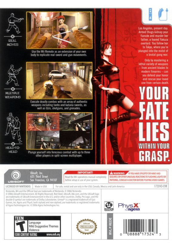 Master the art of sword and gun combat with Red Steel for the Wii. This first-person action game, a launch title for the console, utilizes the Wii Remote and Nunchuk for intuitive motion controls, allowing you to aim your firearm and swing your katana. As an American bodyguard in Japan, you are thrust into the Yakuza underworld to rescue your kidnapped fiancée. Engage in intense firefights and stylish sword duels, learning traditional Japanese swordsmanship. Red Steel aimed to deliver an immersive and innovative action experience, showcasing the Wii's unique control scheme.
