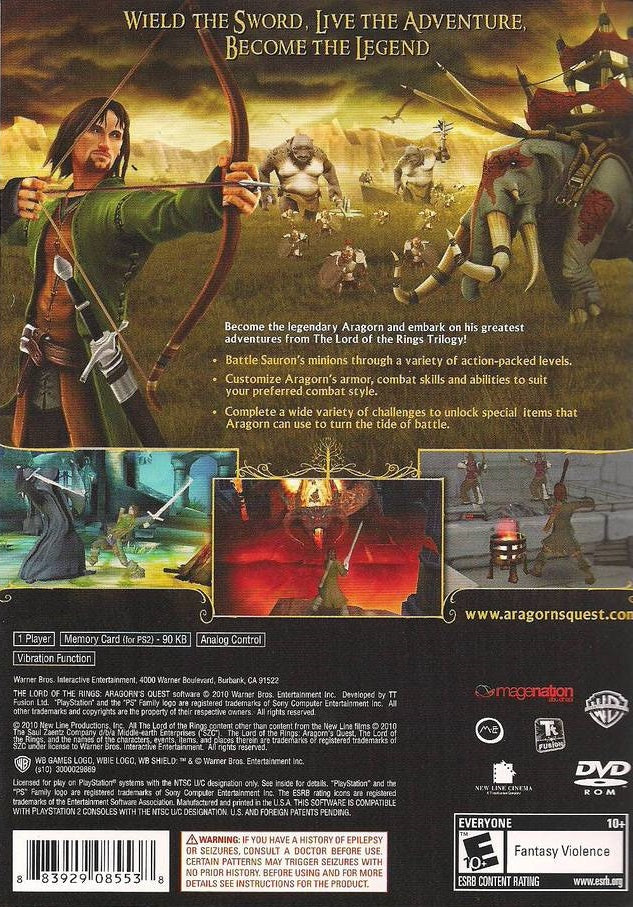 Embark on a family-friendly adventure through Middle-earth in The Lord of the Rings: Aragorn's Quest for the PlayStation 2. Relive Aragorn's most heroic deeds, from his battles as Strider to his coronation as King, as narrated by Samwise Gamgee. Wield sword and bow as Aragorn in this action-adventure designed for younger players, exploring familiar locations and battling iconic foes from The Lord of the Rings trilogy.