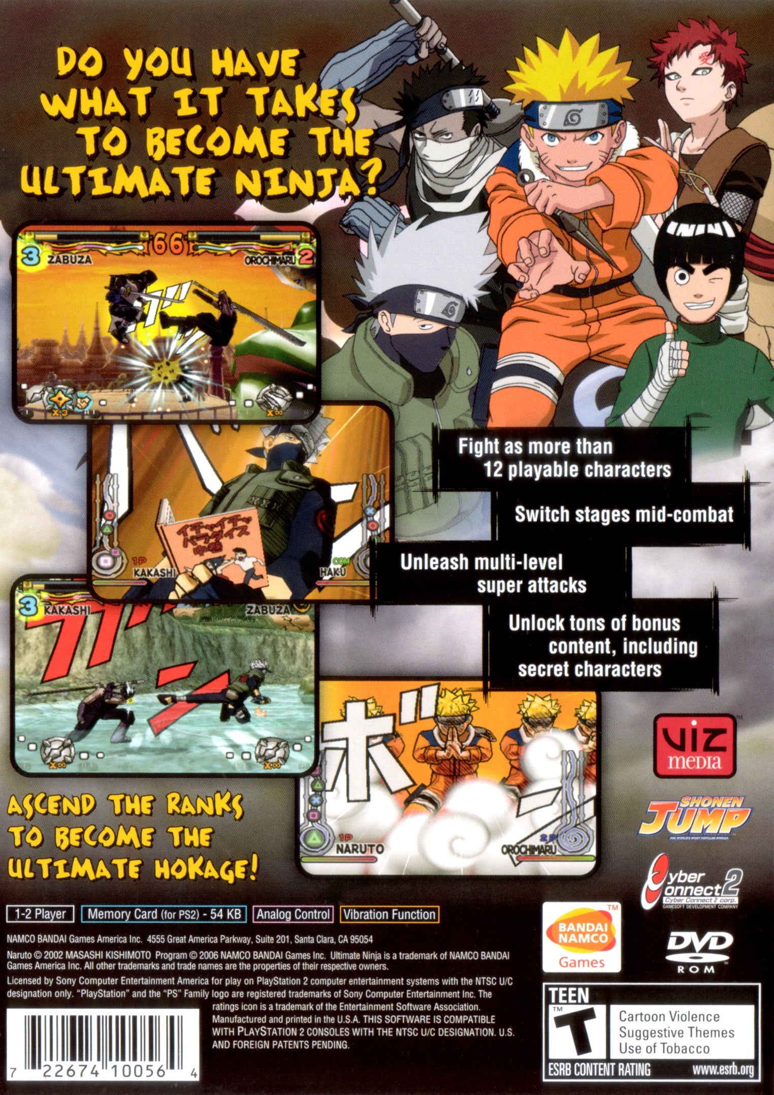 Believe it! Experience the first chapter of the hit anime fighting series with Naruto: Ultimate Ninja for the Playstation 2. This stylish brawler brings the explosive jutsu and acrobatic combat of the series to life with beautiful cel-shaded graphics. Choose from a roster of your favorite ninjas, including Naruto, Sasuke, and Kakashi, and battle it out in dynamic, multi-layered 2.5D arenas. The game features a simple, accessible control scheme that lets you unleash cinematic super moves and dash up walls just like in the show.