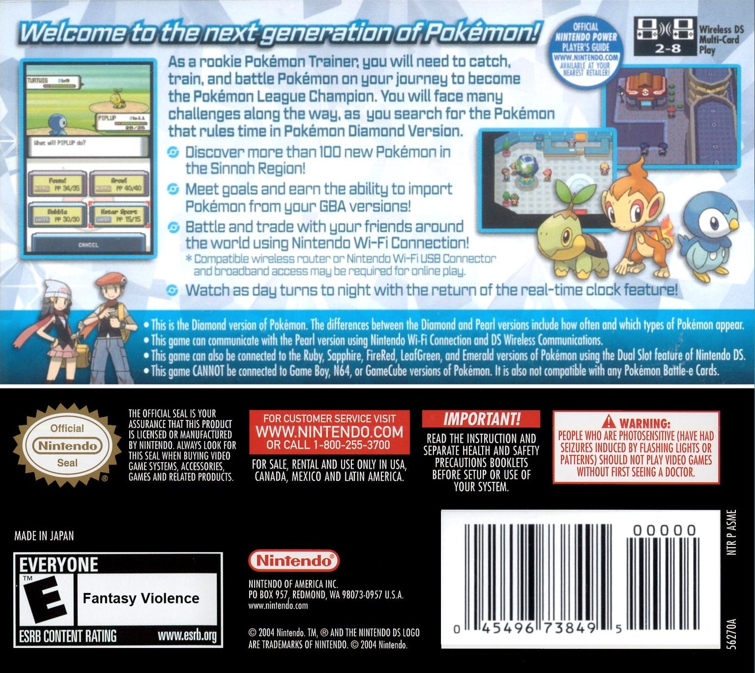 Begin your epic journey through the Sinnoh region in Pokémon Diamond, a captivating Japanese import for the Nintendo DS. This installment introduces a new generation of Pokémon to discover, train, and battle, set against the backdrop of the majestic Mount Coronet. Explore diverse environments, challenge formidable Gym Leaders, and thwart the villainous plans of Team Galactic. With its utilization of the DS's dual screens for enhanced gameplay and the introduction of online features via Nintendo Wi-Fi Connection (service may be discontinued), this Japanese version offers the complete foundational Sinnoh adventure.