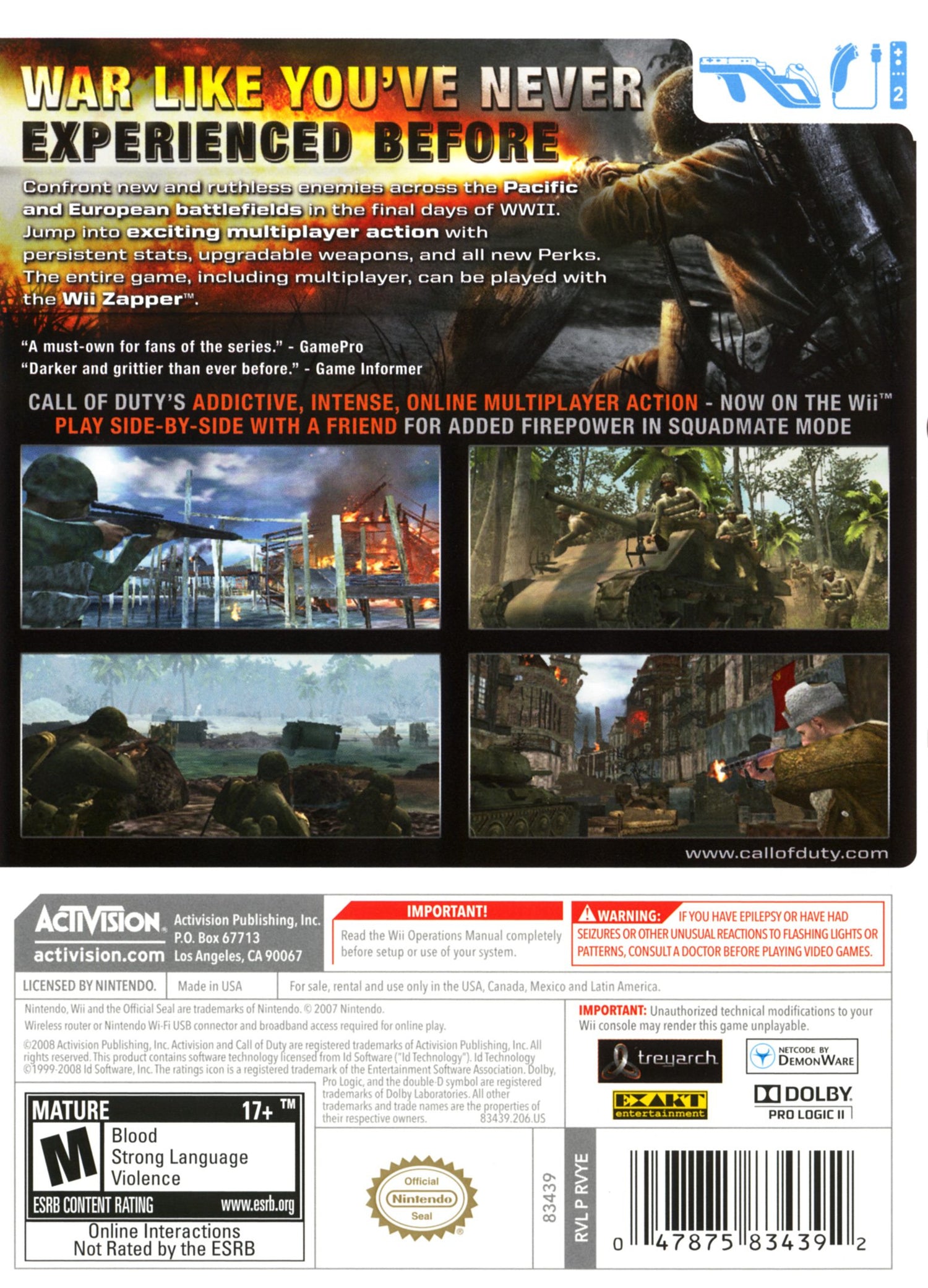 Jugadores de Wii, prepárense para la guerra en 'Call of Duty World at War'. Experimenta la brutalidad de la Segunda Guerra Mundial con un juego inmersivo, intensos tiroteos y una campaña inolvidable.