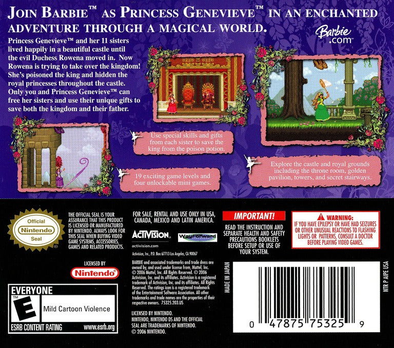 Dance your way through a magical adventure in Barbie in The 12 Dancing Princesses for the Nintendo DS. Join Princess Genevieve and her eleven sisters as they discover a secret entrance to a magical world where wishes come true. When the wicked Duchess Rowena threatens their father’s kingdom, players must guide Genevieve through various levels, using unique abilities and solving puzzles to save the day. The game features enchanting environments to explore and mini-games that test your rhythm and coordination. Fans of the movie will delight in the familiar story and characters, while the platforming gameplay offers a fun challenge for younger players. Step into your ballet shoes and experience a heartwarming tale of family and courage.